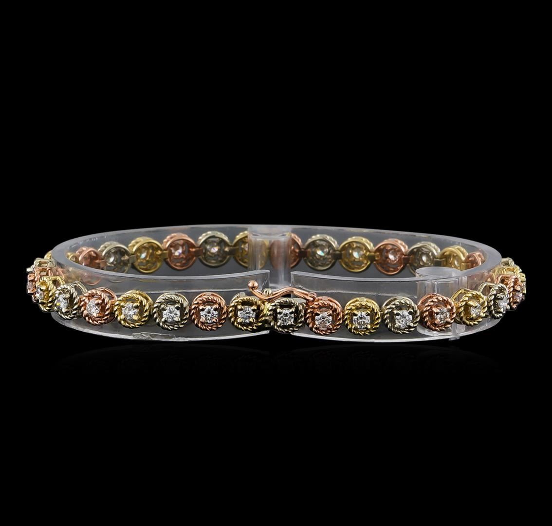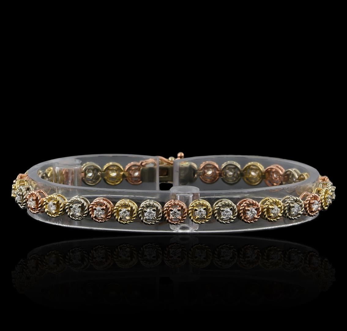 One electronically tested 14KT rose, yellow and white gold ladies cast & assembled diamond bracelet. Seven inch length bracelet composed of a flexible ribbon of diamonds set within tri-colored rope detailed bezels, terminating in a concealed clasp with safety. Bright polish finish. Identified with markings of "K14". Condition is new, good workmanship. Containing: Thirty-Three prong set round brilliant cut diamonds, measuring 2.40 - 2.30 x 1.41mm exact total weight 33 Stones = 1.65ct. Graded in the setting. Clarity: SI-2 to I-1. Color: G - I. Total Weight of Diamonds 1.65ct. Total Weight of Bracelet 12.00gm. AIG Appraised.