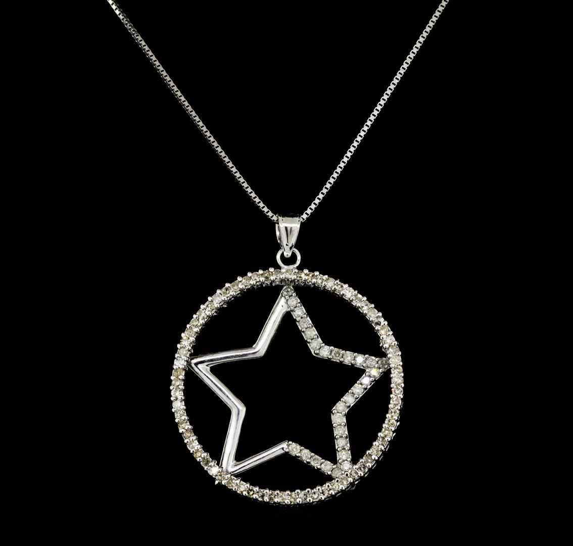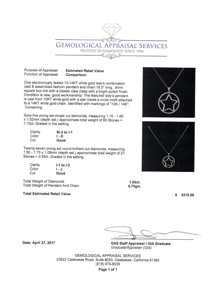 One electronically tested 10-14KT white gold lady's combination cast & assembled fashion pendant and chain 18.0' long,.8mm square box link with a lobster claw clasp with a bright polish finish. The featured lady's pendant is cast from 10KT white gold with a star inside a circle motif attached to a 14KT white gold chain. Identified with markings of '10K / 14K'. Condition is new, good workmanship. Containing: Sixty-Five prong set single cut diamonds, measuring 1.70 - 1.60 x 1.02mm (depth est.) approximate total weight of 65 Stones = 1.10ct. Graded in the setting. Color I - K Clarity SI-2 to I-1 Cut Good Twenty-Seven prong set round brilliant cut diamonds, measuring 1.80 - 1.70 x 1.08mm (depth est.) approximate total weight of 27 Stones = 0.55ct. Graded in the setting. Color I - J Clarity I-1 to I-2 Cut Good. Total Weight of Diamonds 1.65ct.. Total Weight of Pendant And Chain 8.70gm GAS Appraised at $3215.00. GAS Appraised at $3,215.00.