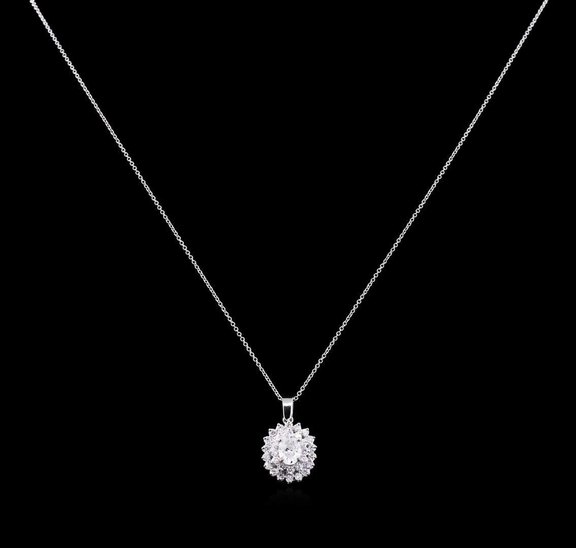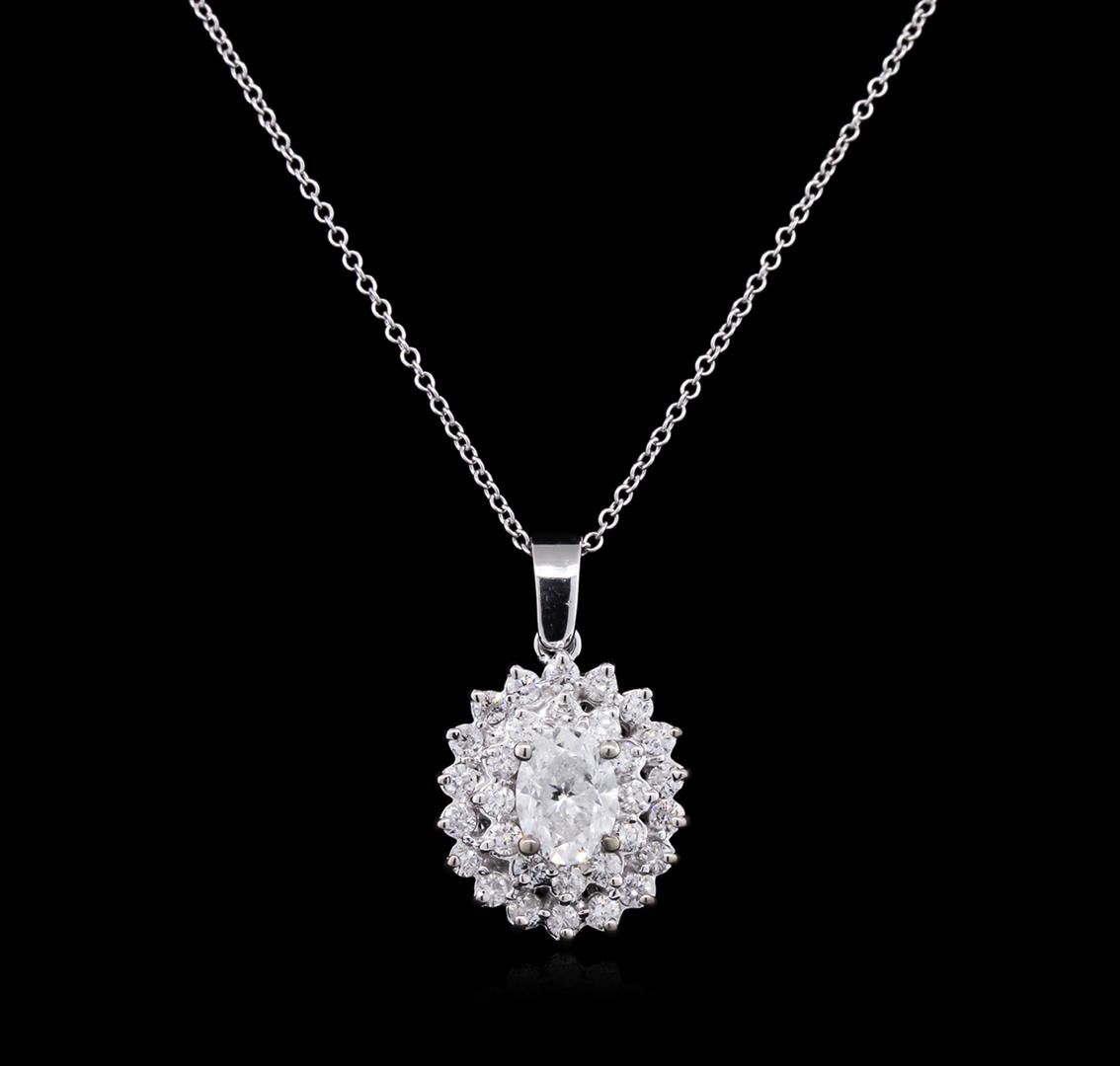 One electronically tested 14KT white gold lady's combination cast & assembled fashion pendant & chain 18.0" long, 1mm round cable link with a spring ring clasp with a basket double halo with a bright polish finish. Identified with markings of "K14". Condition is new, good workmanship. Containing: One prong set oval shaped cut diamond, measuring 7.16 x 5.23 x 3.70mm (depth est.) , 15.00.%. GTCF approximate weight of 1.01ct. Graded in the setting. Clarity: SI-2. Color: G - H. Cut Good Thirty prong set round brilliant cut diamonds, measuring 1.80 - 1.75 x 1.10mm (depth est.) approximate total weight of 30 Stones = 0.64ct. Graded in the setting. Clarity: SI-1 to I-1. Color: G - Good. Total Weight of Diamonds 1.65ct. Total Weight of Pendant & Chain 4.00gm. GAS Appraised at $12,705.00.