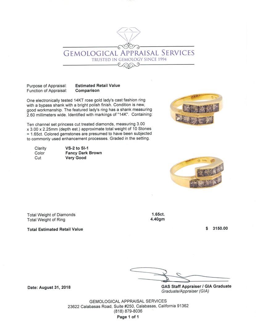 One electronically tested 14KT rose gold lady's cast fashion ring with a bypass shank with a bright polish finish. The featured lady's ring has a shank measuring 2.60 millimeters wide. Identified with markings of '14K'. Condition is new, good workmanship. Containing: Ten channel set princess cut treated diamonds, measuring 3.00 x 3.00 x 2.25mm (depth est.) approximate total weight of 10 Stones = 1.65ct. Colored gemstones are presumed to have been subjected to commonly used enhancement processes. Graded in the setting. Color Fancy Dark Brown Clarity VS-2 to SI-1 Cut Very Good. Total Weight of Diamonds 1.65ct.. Total Weight of Ring 4.40gm GAS Appraised at $3150.00. GAS Appraised at $3,150.00.