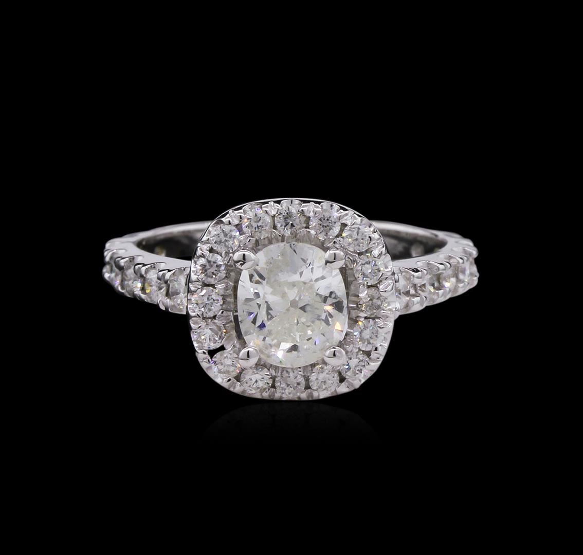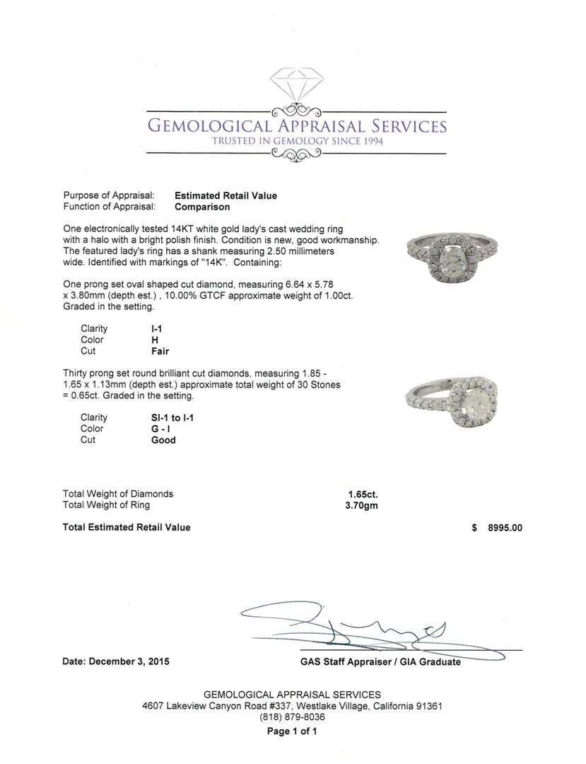 One electronically tested 14KT white gold lady's cast wedding ring with a halo with a bright polish finish. The featured lady's ring has a shank measuring 2.50 millimeters wide. Identified with markings of "14K". Condition is new, good workmanship. Containing: One prong set oval shaped cut diamond, measuring 6.64 x 5.78 x 3.80mm (depth est.) , 10.00.%. GTCF approximate weight of 1.00ct. Graded in the setting. Clarity: I-1. Color: H. Cut Fair Thirty prong set round brilliant cut diamonds, measuring 1.85 - 1.65 x 1.13mm (depth est.) approximate total weight of 30 Stones = 0.65ct. Graded in the setting. Clarity: SI-1 to I-1. Color: G - I. Cut Good. Total Weight of Diamonds 1.65ct. Total Weight of Ring 3.70gm. GAS Appraised.