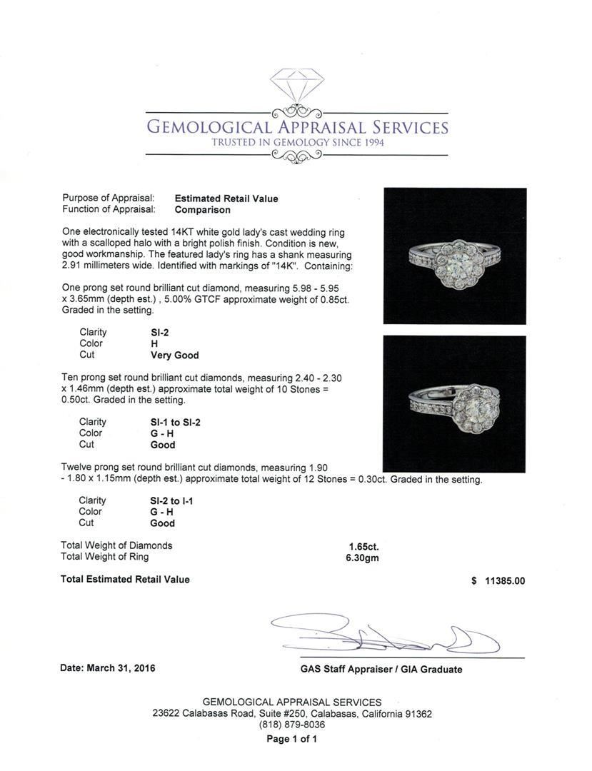 One electronically tested 14KT white gold lady's cast wedding ring with a scalloped halo with a bright polish finish. The featured lady's ring has a shank measuring 2.91 millimeters wide. Identified with markings of "14K". Condition is new, good workmanship. Containing: One prong set round brilliant cut diamond, measuring 5.98 - 5.95 x 3.65mm (depth est.) , 5.00.%. GTCF approximate weight of 0.85ct. Graded in the setting. Clarity: SI-2. Color: Very Good Ten prong set round brilliant cut diamonds, measuring 2.40 - 2.30 x 1.46mm (depth est.) approximate total weight of 10 Stones = 0.50ct. Graded in the setting. Clarity: SI-1 to SI-2. Color: G - Good Twelve prong set round brilliant cut diamonds, measuring 1.90 - 1.80 x 1.15mm (depth est.) approximate total weight of 12 Stones = 0.30ct. Graded in the setting. Clarity: SI-2 to I-1. Color: G - Good. Total Weight of Diamonds 1.65ct. Total Weight of Ring 6.30gm GAS Appraised.