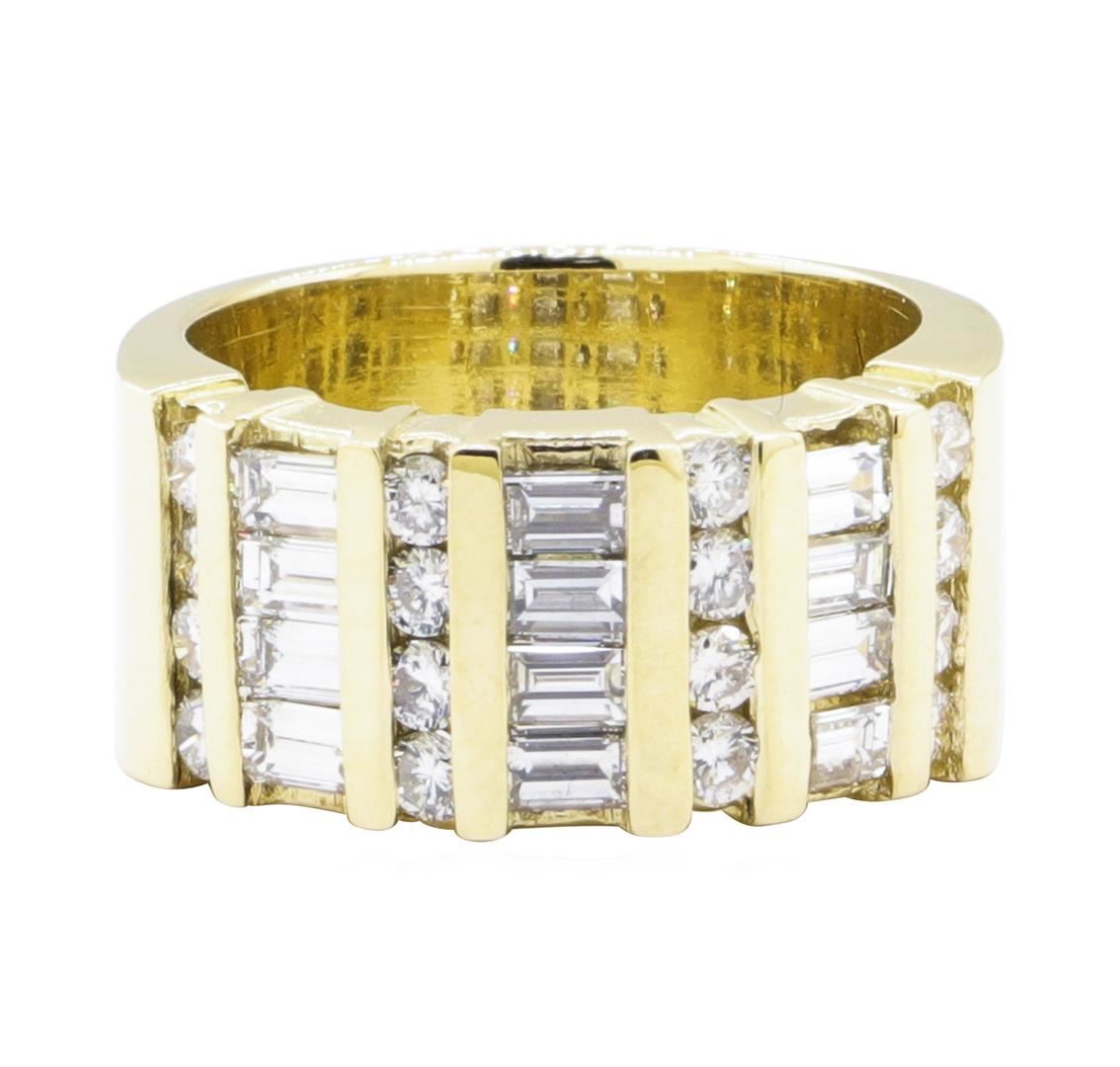 One electronically tested 14KT yellow gold lady's cast fashion ring with a four row wide band with a bright polish finish. The featured lady's ring has a shank measuring 9.00 millimeters wide. Condition is Good. Containing: Twelve channel set baguette cut diamonds, measuring from 2.90 x 2.00 x 1.70mm (depth est.) to 3.00 x 2.10 x 1.79mm (depth est.) approximate total weight of 12 Stones = 1.15ct. Graded in the setting. Color G - H Clarity VS-1 to VS-2 Cut Very Good Sixteen channel set round brilliant cut diamonds, measuring 2.10 - 2.00 x 1.23mm (depth est.) approximate total weight of 16 Stones = 0.50ct. Graded in the setting. Color G - I Clarity VS-2 to SI-1 Cut Very Good. Total Weight of Diamonds 1.65ct.. Total Weight of Ring 13.10gm GAS Appraised at $6350.00. GAS Appraised.