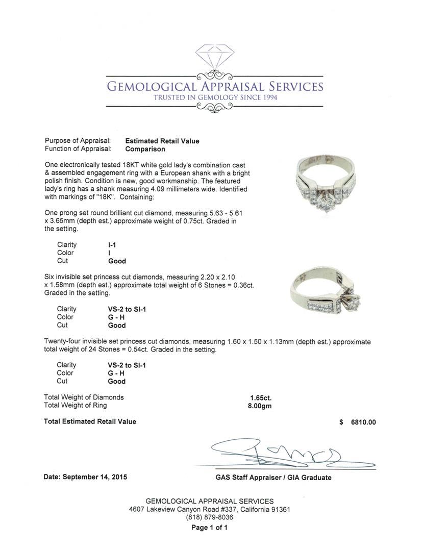One electronically tested 18KT white gold lady's combination cast & assembled engagement ring with a European shank with a bright polish finish. The featured lady's ring has a shank measuring 4.09 millimeters wide. Identified with markings of "18K". Condition is new, good workmanship. Containing: One prong set round brilliant cut diamond, measuring 5.63 - 5.61 x 3.65mm (depth est.) approximate weight of 0.75ct. Graded in the setting. Clarity: I-1. Color: I. Cut Good Six invisible set princess cut diamonds, measuring 2.20 x 2.10 x 1.58mm (depth est.) approximate total weight of 6 Stones = 0.36ct. Graded in the setting. Clarity: VS-2 to SI-1. Color: G - Good Twenty-Four invisible set princess cut diamonds, measuring 1.60 x 1.50 x 1.13mm (depth est.) approximate total weight of 24 Stones = 0.54ct. Graded in the setting. Clarity: VS-2 to SI-1. Color: G - Good. Total Weight of Diamonds 1.65ct. Total Weight of Ring 8.00gm. GAS Appraised at $6,810.00.