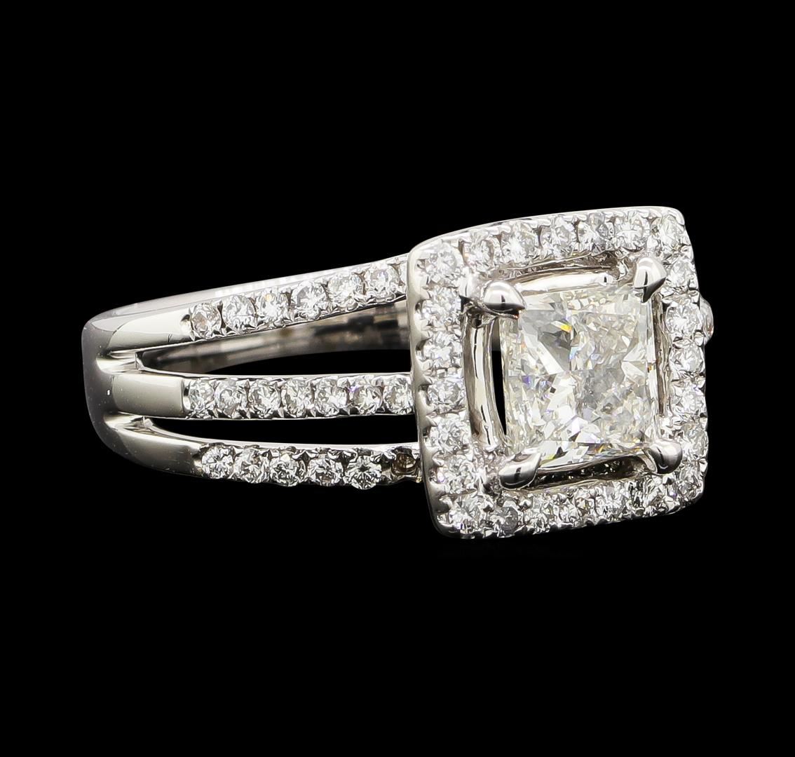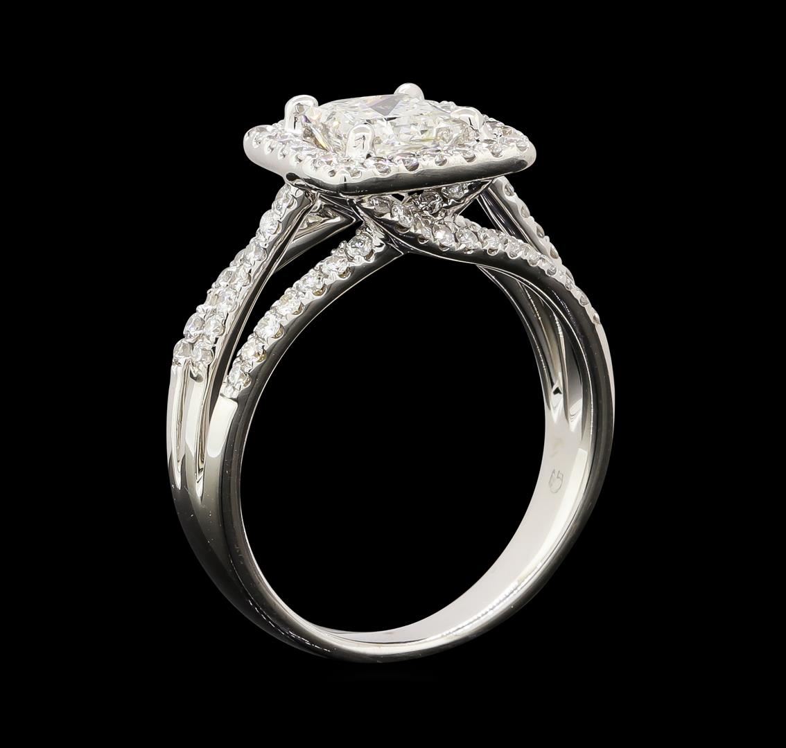 One electronically tested 18KT white gold lady's combination cast & assembled wedding ring with a triple split crossover shank with a bright polish finish. The featured lady's ring has a halo and a shank measuring 2.81 millimeters wide. Identified with markings of '18K'. Condition is new, good workmanship. Containing: One prong set princess rectangular cut diamond, measuring 5.56 x 5.21 x 3.88mm (depth est.) approximate weight of 1.05ct. Graded in the setting. Clarity I-1. Color: I - J Cut Very Good Seventy-Six prong set round brilliant cut diamonds, measuring 1.30 - 1.25 x 0.79mm (depth est.) approximate total weight of 76 Stones = 0.60ct. Graded in the setting. Clarity SI-1 to SI-2. Color: G - I Cut Good. Total Weight of Diamonds 1.65ct.. Total Weight of Ring 5.60gm. GAS Appraised at $10,490.00.