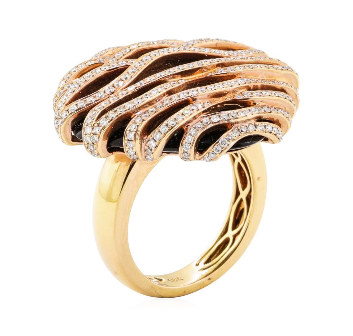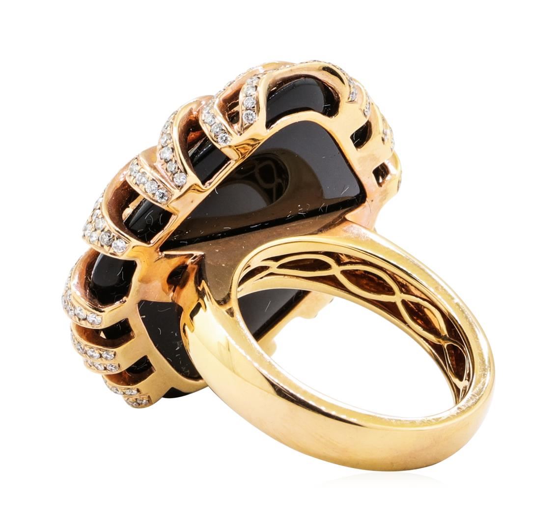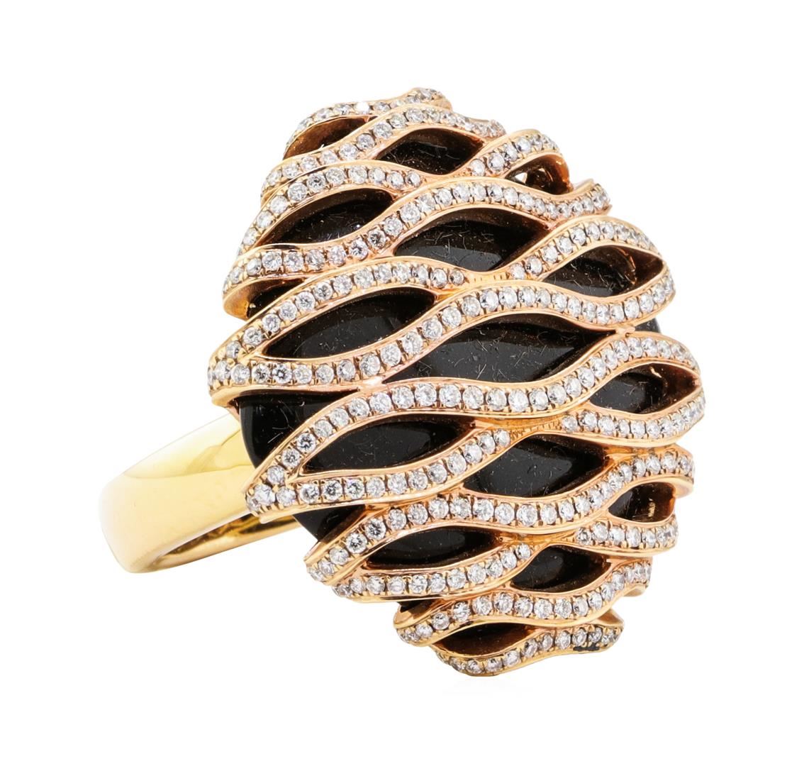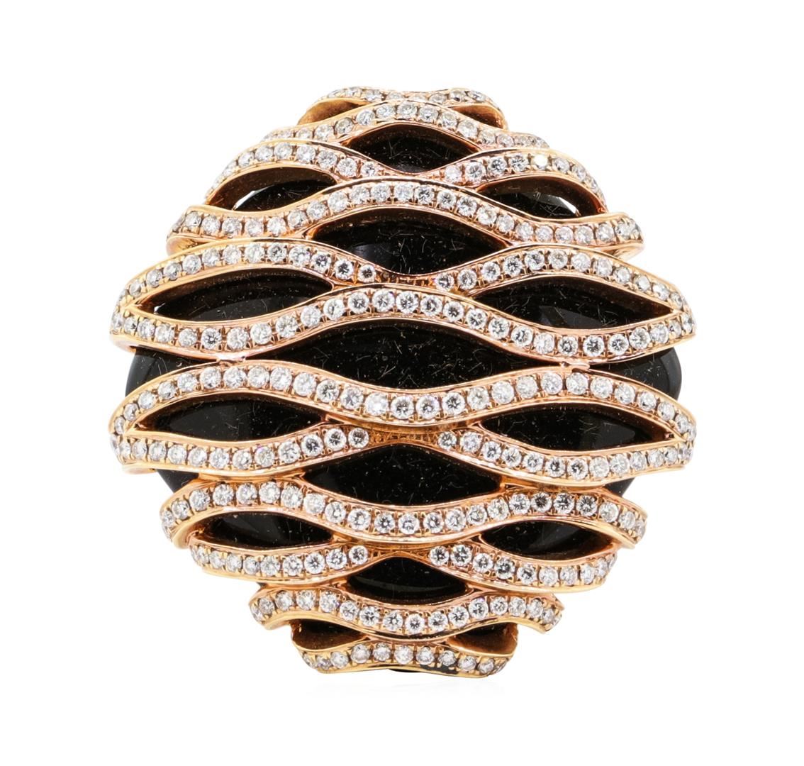 One electronically tested 18KT rose gold lady's combination cast & assembled fashion ring with a square cushion top with a bright polish finish. The featured lady's ring has a 24mm x 24mm square cushion cabochon cut piece of black onyx. The ring has overlapping wave motifs and a shank measuring 4.00 millimeters wide. Identified with markings of '18K'. Condition is new, good workmanship. Containing: Two Hundred Ninety-Four prong set round brilliant cut diamonds, measuring 1.20 - 1.10 x 0.69mm (depth est.) approximate total weight of 294 Stones = 1.65ct. Graded in the setting. Color H - I Clarity VS-1 to VS-2 Cut Very Good. Total Weight of Diamonds 1.65ct.. Total Weight of Ring 20.70gm GAS Appraised at $8540.00. GAS Appraised.