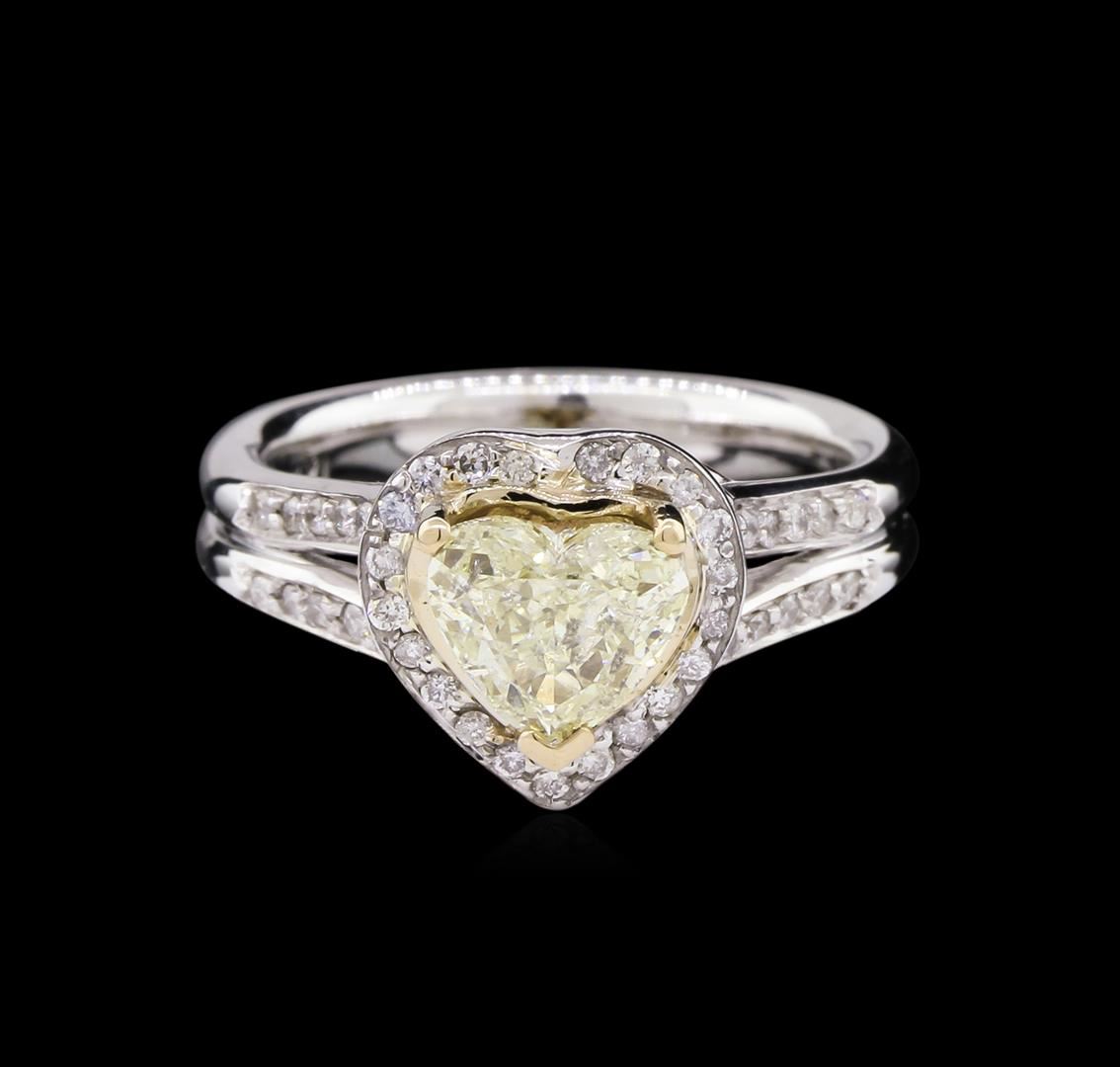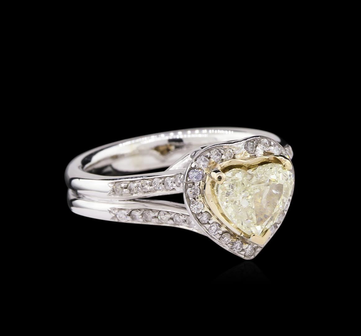 One electronically tested 14KT white and yellow gold lady's combination cast & assembled fashion ring with a double split shank with a bright polish finish. The featured lady's ring has a double shank measuring 4.05 millimeters wide. Identified with markings of "14K". Condition is new, good workmanship. Containing: One prong set heart shaped cut diamond, measuring 6.30 x 7.20 x 4.54mm (depth est.) , 10.00% GTCF approximate weight of 1.37ct. Colored gemstones are presumed to have been subjected to commonly used enhancement processes. Graded in the setting. Clarity: SI-2 Cut Very Good Forty-Five prong set round brilliant cut diamonds, measuring 1.20 - 1.15 x 0.74mm (depth est.) approximate total weight of 45 Stones = 0.28ct. Clarity: SI-1 to I-1. Color: H - I. Cut Good. Total Weight of Diamonds 1.65ct. Total Weight of Ring 7.50gm. GAS Appraised at $14,120.00.