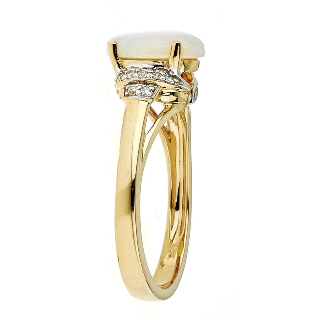 One Australian Opal and Diamond Ring featuring: 14KT Yellow Gold with a total weight of 3.60 grams, Australian Opal with a total weight of 1.65ct, and 16 Diamonds with a total weight of 0.11ctw.