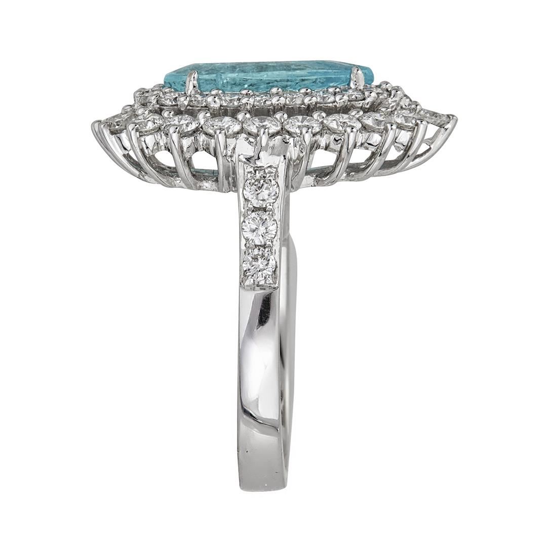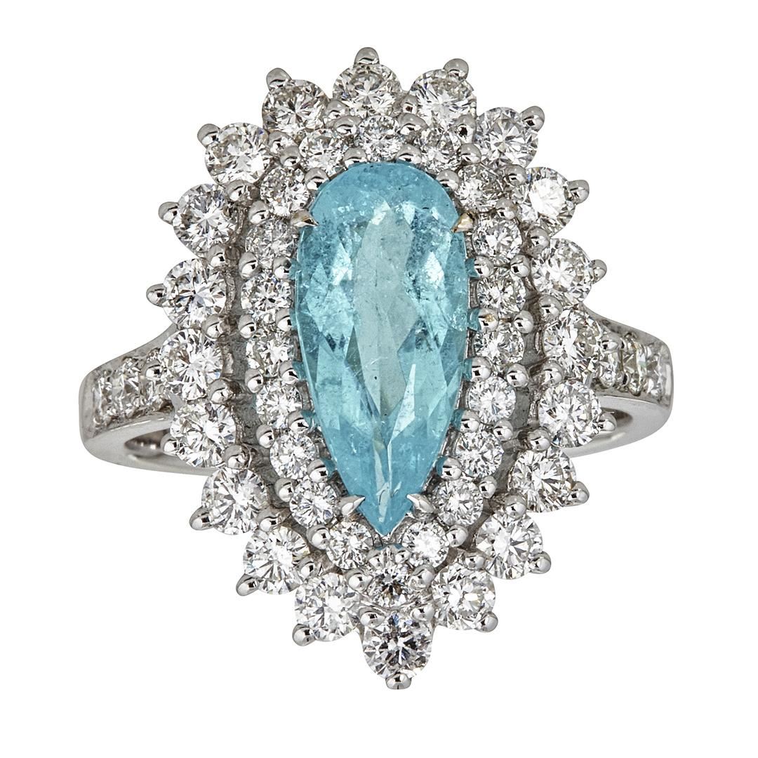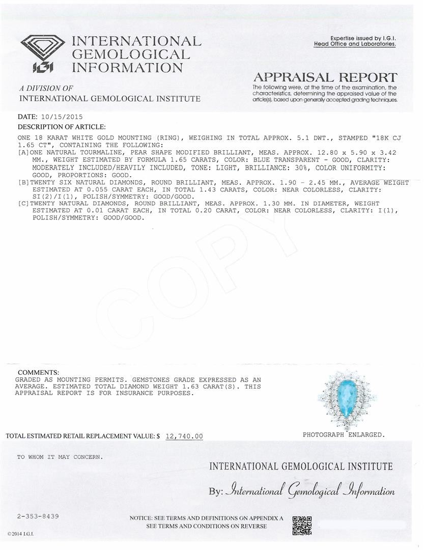 One 18KT white gold ring, weighing in total approx. 5.1 dwt., stamped "18K CJ 1.65", containing the following: One natural paraiba tourmaline, pear shape modified brilliant, measuring approx. 12.80 x 5.90 x 3.42 mm, weight estimated by formula 1.65ct, color: blue transparent - good, clarity: moderately included/heavily included, tone: light, brilliance: 30%, color uniformity: good, proportions: good. Twenty six natural diamonds, round brilliant, measuring approx. 1.90 - 2.45 mm in diameter, average weight estimated at 0.055ct each, in total 1.43ct, color: near colorless, clarity: SI2/I1, polish/symmetry: good/good. Twenty natural diamonds, round brilliant, measuring approx. 1.30 mm in diameter, weight estimated at 0.01ct each, in total 0.20ct, color: near colorless, clarity: I1, polish/symmetry: good/good. IGI Appraised at $12,740.00.