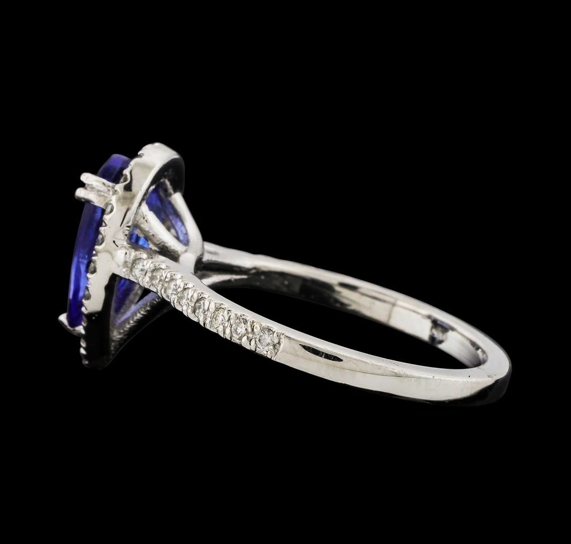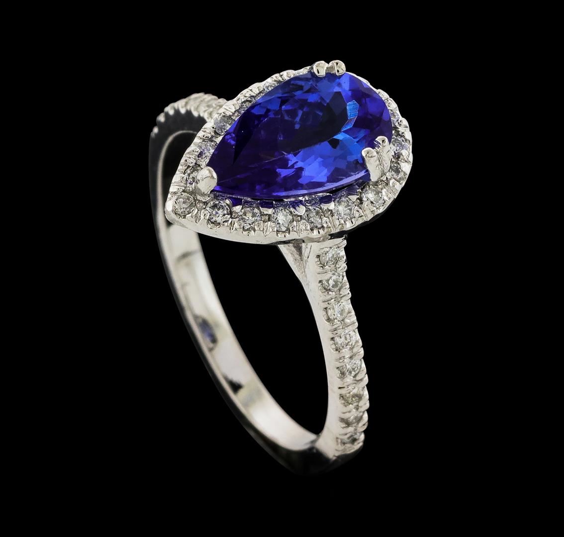 One Tanzanite and Diamond Ring featuring: 14KT White Gold with a total weight of 3.30 grams, Tanzanite with a total weight of 1.65ct, and 34 diamonds with a total weight of 0.27ctw.