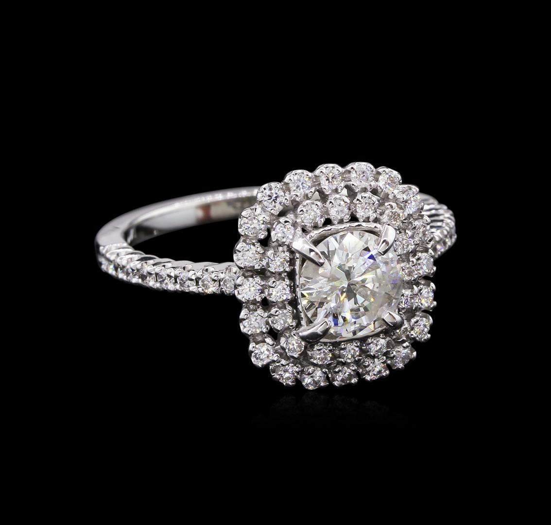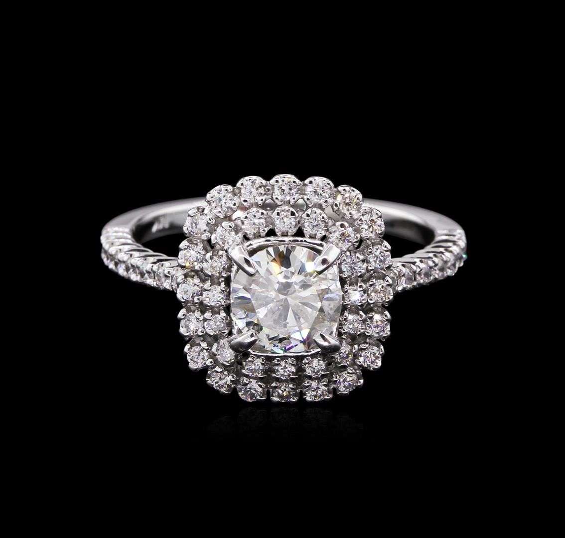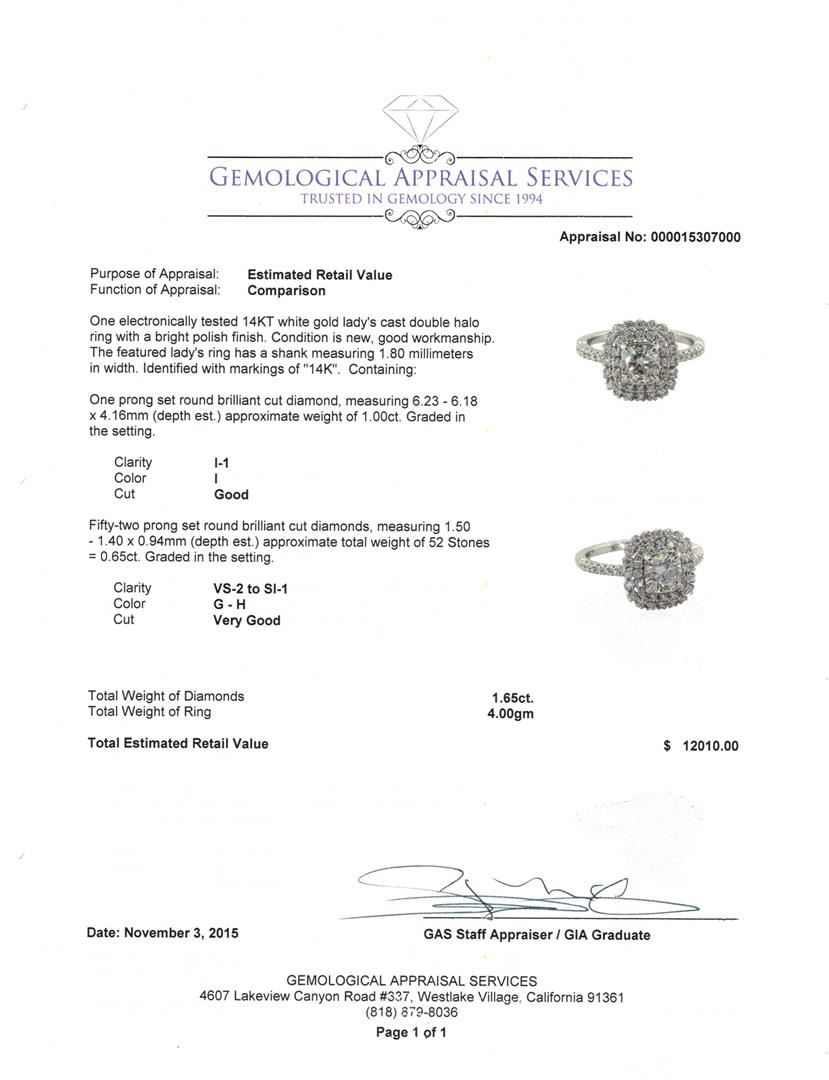 One electronically tested 14KT white gold lady's cast double halo ring with a bright polish finish. The featured lady's ring has a shank measuring 1.80 millimeters in width. Identified with markings of "14K". Condition is new, good workmanship. Containing: One prong set round brilliant cut diamond, measuring 6.23 - 6.18 x 4.16mm (depth est.) approximate weight of 1.00ct. Graded in the setting. Clarity: I-1. Color: I. Cut Good Fifty-Two prong set round brilliant cut diamonds, measuring 1.50 - 1.40 x 0.94mm (depth est.) approximate total weight of 52 Stones = 0.65ct. Graded in the setting. Clarity: VS-2 to SI-1. Color: G - Very Good. Total Weight of Diamonds 1.65ct. Total Weight of Ring 4.00gm GAS Appraised at $12,010.00.