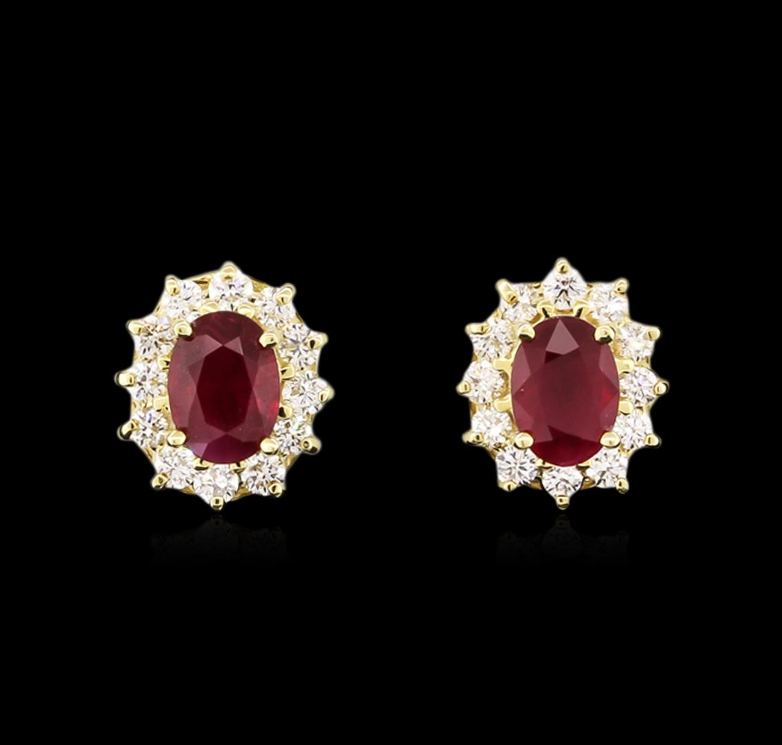 One pair electronically tested 18KT yellow gold ladies cast ruby and diamond earrings with friction posts with a bright polish finish. Identified with markings of "750". Condition is new. Containing: Two prong set oval modified brilliant cut natural rubies, measuring 7.00 x 5.00 x 3.25mm, approximate total weight of 1.65ct., clarity is heavily included, medium, moderately strong, red color, (GIA R 5/4), cut is good. Twenty-Four prong set round brilliant cut diamonds, measuring 1.80 - 1.80 x 1.08mm (depth est.) approximate total weight of 24 Stones = 0.72ct. Clarity: VS-1. Color: I - J, Cut is Good. Colored gemstones are presumed to have been subjected to commonly used enhancement processes. All diamonds and colored gemstones are graded in the mounting, unless otherwise stated. Total Weight of Colored Stones 1.65ct. Total Weight of Diamonds 0.72ct. Total Weight of Earrings 4.60 grams. GGL Appraised at $4,585.00.