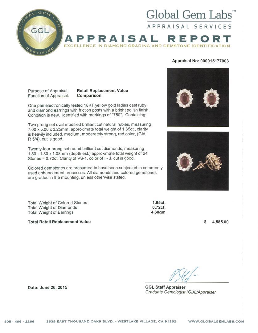 One pair electronically tested 18KT yellow gold ladies cast ruby and diamond earrings with friction posts with a bright polish finish. Identified with markings of "750". Condition is new. Containing: Two prong set oval modified brilliant cut natural rubies, measuring 7.00 x 5.00 x 3.25mm, approximate total weight of 1.65ct., clarity is heavily included, medium, moderately strong, red color, (GIA R 5/4), cut is good. Twenty-Four prong set round brilliant cut diamonds, measuring 1.80 - 1.80 x 1.08mm (depth est.) approximate total weight of 24 Stones = 0.72ct. Clarity: VS-1. Color: I - J, Cut is Good. Colored gemstones are presumed to have been subjected to commonly used enhancement processes. All diamonds and colored gemstones are graded in the mounting, unless otherwise stated. Total Weight of Colored Stones 1.65ct. Total Weight of Diamonds 0.72ct. Total Weight of Earrings 4.60 grams. GGL Appraised at $4,585.00.