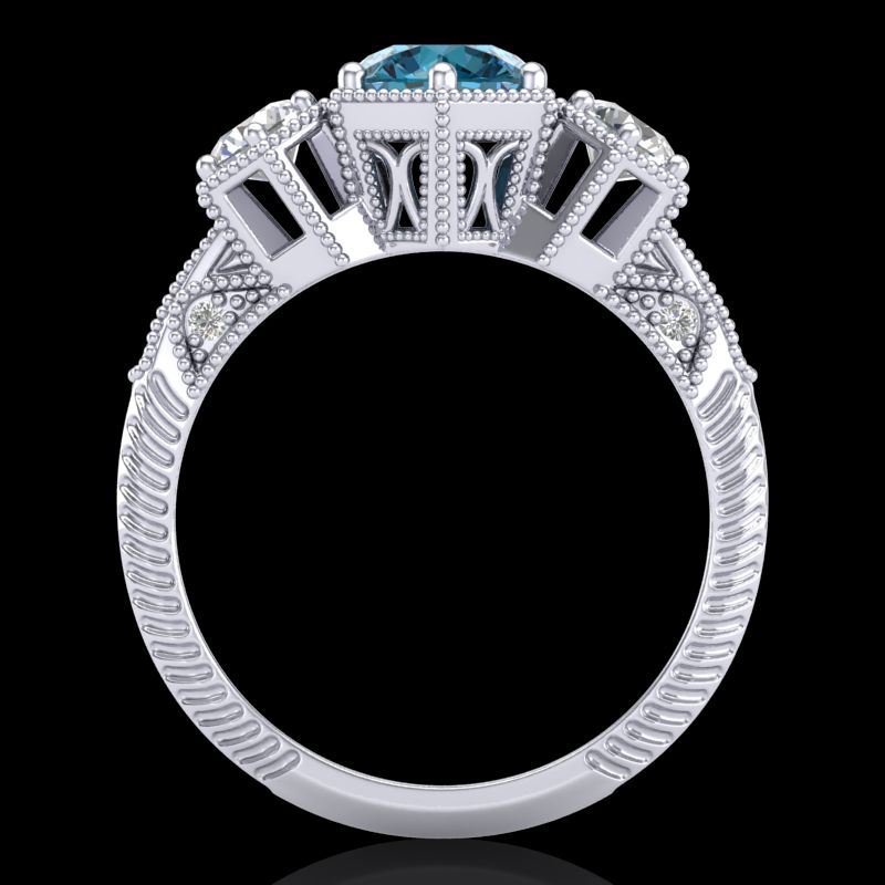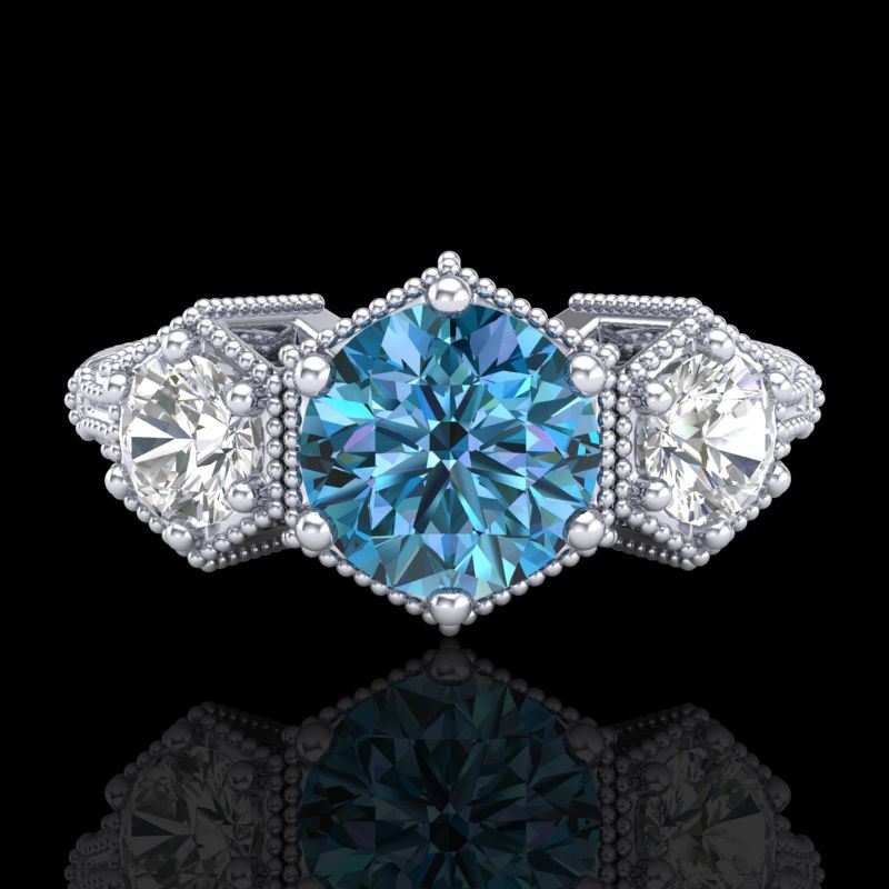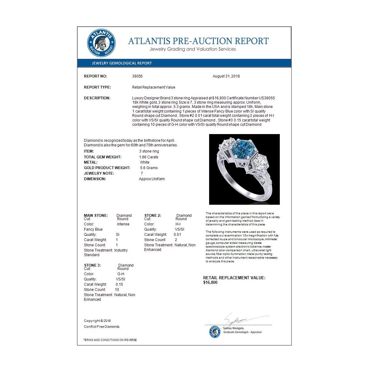 REF-254M5H -38055 ---- 1.66 CTW Intense Blue Diamond Solitaire Art Deco 3 Stone Ring 18K White Gold ---- Luxury Designer Brand 3 stone ring Appraised at $16,800 Certificate Number US38055 18k White gold, 3 stone ring Size is 7, 3 stone ring measuring approx. Uniform, weighing in total approx. 5.3 grams. Made in the USA and is stamped 18k, Main stone 1 carat total weight containing 1 pieces of Intense Fancy Blue color with SI quality Round shape cut Diamond , Stone #2 0.51 carat total weight containing 2 pieces of H-I color with VS/SI quality Round shape cut Diamond , Stone #3 0.15 carat total weight containing 10 pieces of G-H color with VS/SI quality Round shape cut Diamond