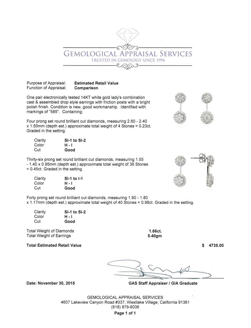 One pair electronically tested 14KT white gold lady's combination cast & assembled drop style earrings with friction posts with a bright polish finish. Identified with markings of "585". Condition is new, good workmanship. Containing: Four prong set round brilliant cut diamonds, measuring 2.60 - 2.40 x 1.50mm (depth est.) approximate total weight of 4 Stones = 0.23ct. Graded in the setting. Clarity: SI-1 to SI-2 . Color: H - I. Cut Good Thirty-Six prong set round brilliant cut diamonds, measuring 1.55 - 1.40 x 0.95mm (depth est.) approximate total weight of 36 Stones = 0.45ct. Graded in the setting. Clarity: SI-1 to I-1 . Color: H - I. Cut Good Forty prong set round brilliant cut diamonds, measuring 1.90 - 1.80 x 1.17mm (depth est.) approximate total weight of 40 Stones = 0.98ct. Graded in the setting. Clarity: SI-1 to SI-2 . Color: H - I. Cut Good. Total Weight of Diamonds 1.66ct.. Total Weight of Earrings 5.40gm at $ 4735.00 GAS Appraised.