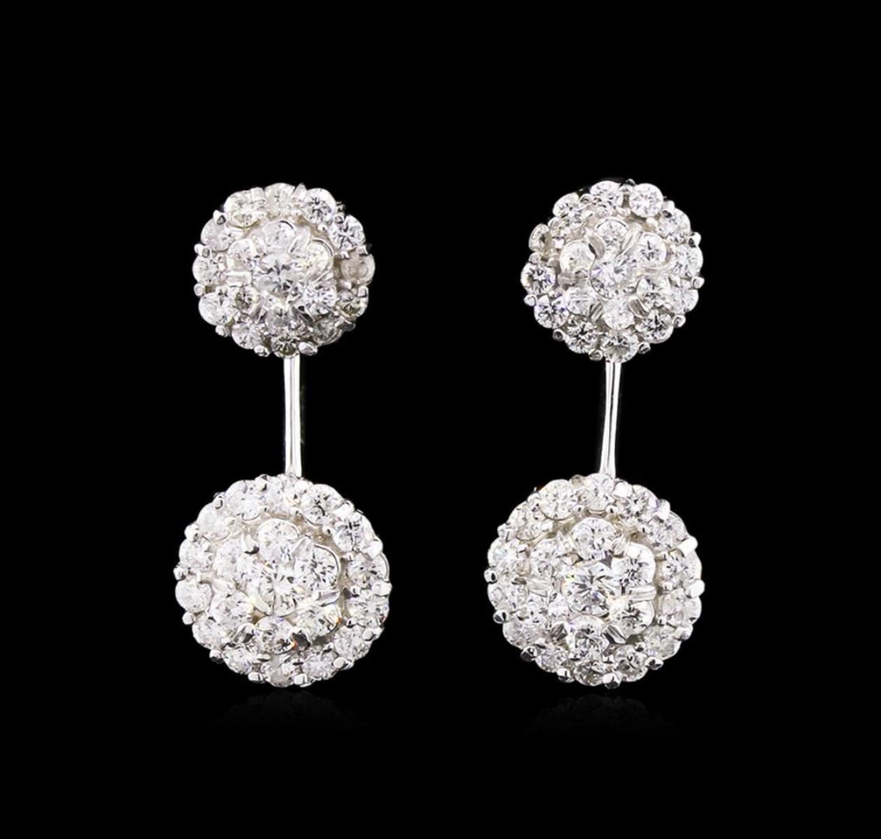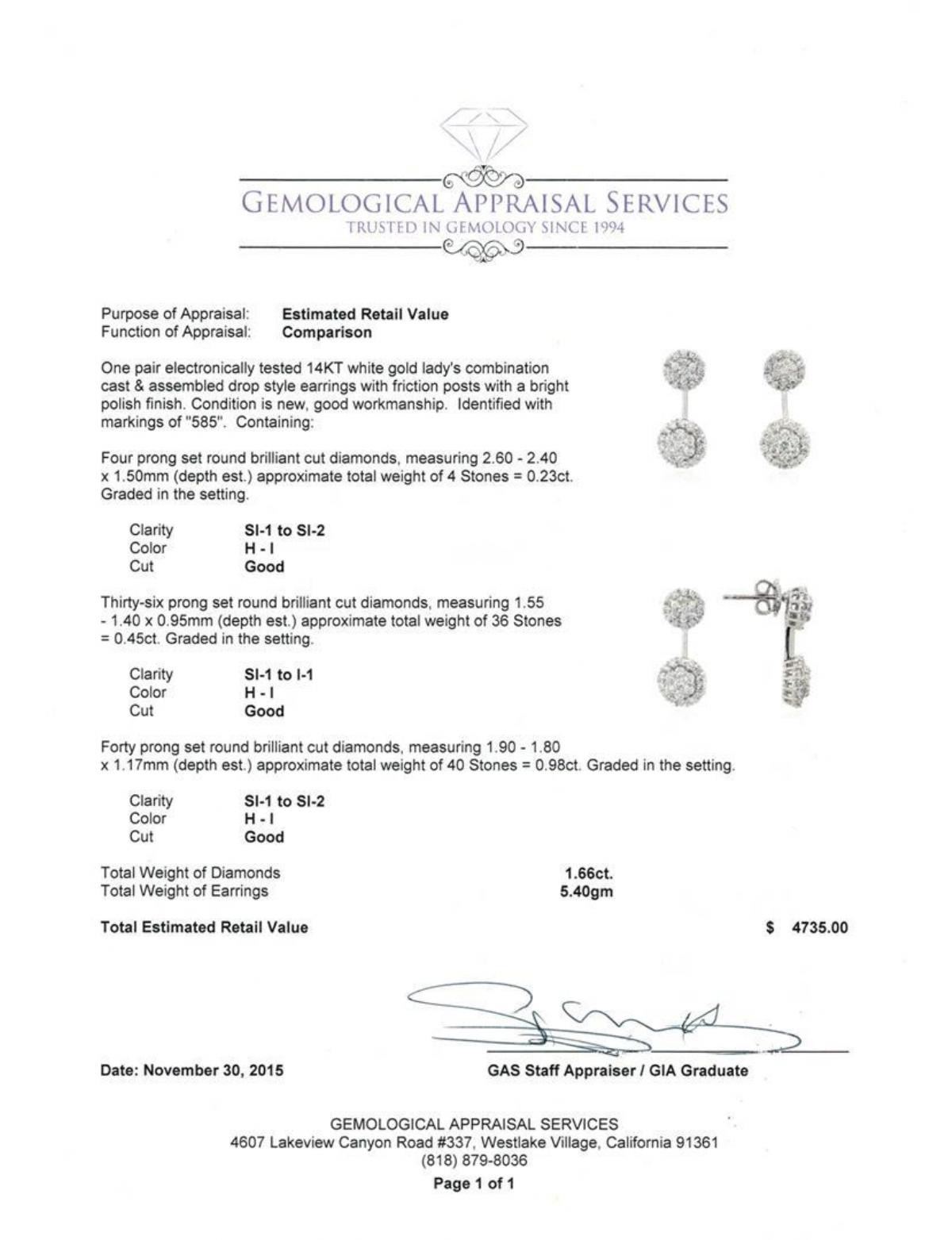 One pair electronically tested 14KT white gold lady's combination cast & assembled drop style earrings with friction posts with a bright polish finish. Identified with markings of "585". Condition is new, good workmanship. Containing: Four prong set round brilliant cut diamonds, measuring 2.60 - 2.40 x 1.50mm (depth est.) approximate total weight of 4 Stones = 0.23ct. Graded in the setting. Clarity: SI-1 to SI-2 . Color: H - I. Cut Good Thirty-Six prong set round brilliant cut diamonds, measuring 1.55 - 1.40 x 0.95mm (depth est.) approximate total weight of 36 Stones = 0.45ct. Graded in the setting. Clarity: SI-1 to I-1 . Color: H - I. Cut Good Forty prong set round brilliant cut diamonds, measuring 1.90 - 1.80 x 1.17mm (depth est.) approximate total weight of 40 Stones = 0.98ct. Graded in the setting. Clarity: SI-1 to SI-2 . Color: H - I. Cut Good. Total Weight of Diamonds 1.66ct.. Total Weight of Earrings 5.40gm at $ 4735.00 GAS Appraised.