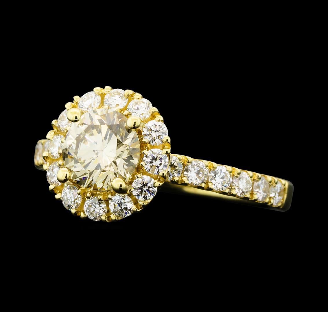 One electronically tested 14KT yellow gold lady's cast wedding ring with a cathedral halo with a bright polish finish. The featured lady's ring has a shank measuring 1.80 millimeters wide. Identified with markings of '14K'. Condition is new, good workmanship. Containing: One prong set round brilliant cut diamond, measuring 6.30 - 6.24 x 3.86mm (depth est.) approximate weight of 0.96ct. Graded in the setting. Clarity SI-1 Cut Very Good Twenty-Four prong set round brilliant cut diamonds, measuring 2.00 - 1.90 x 1.21mm (depth est.) approximate total weight of 24 Stones = 0.70 ct. Graded in the setting. Clarity SI-1 to SI-2. Color: G - I Cut Good. Total Weight of Diamonds 1.66ct.. Total Weight of Ring 3.40gm. GAS Appraised.