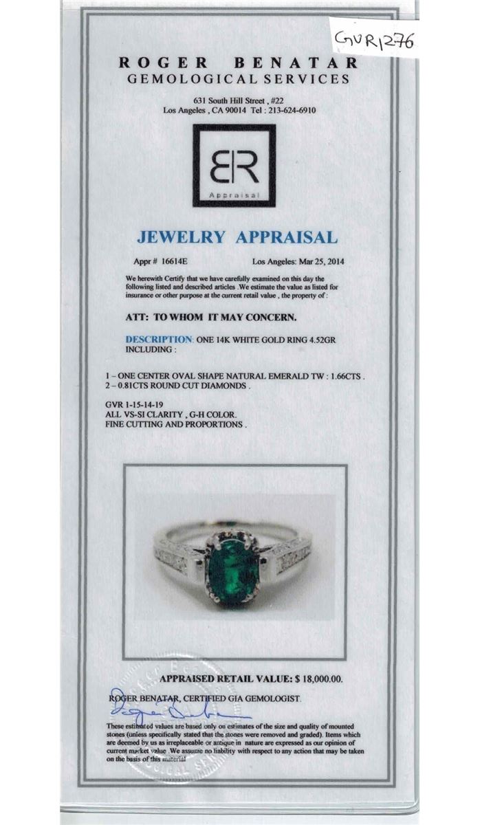 14K WHITE GOLD NATURAL COLUMBIAN EMERALD RING: 4.52GRAM /EMERALD OVAL: 1.66CT/DIAMOND :0.81CT/#GVR1276