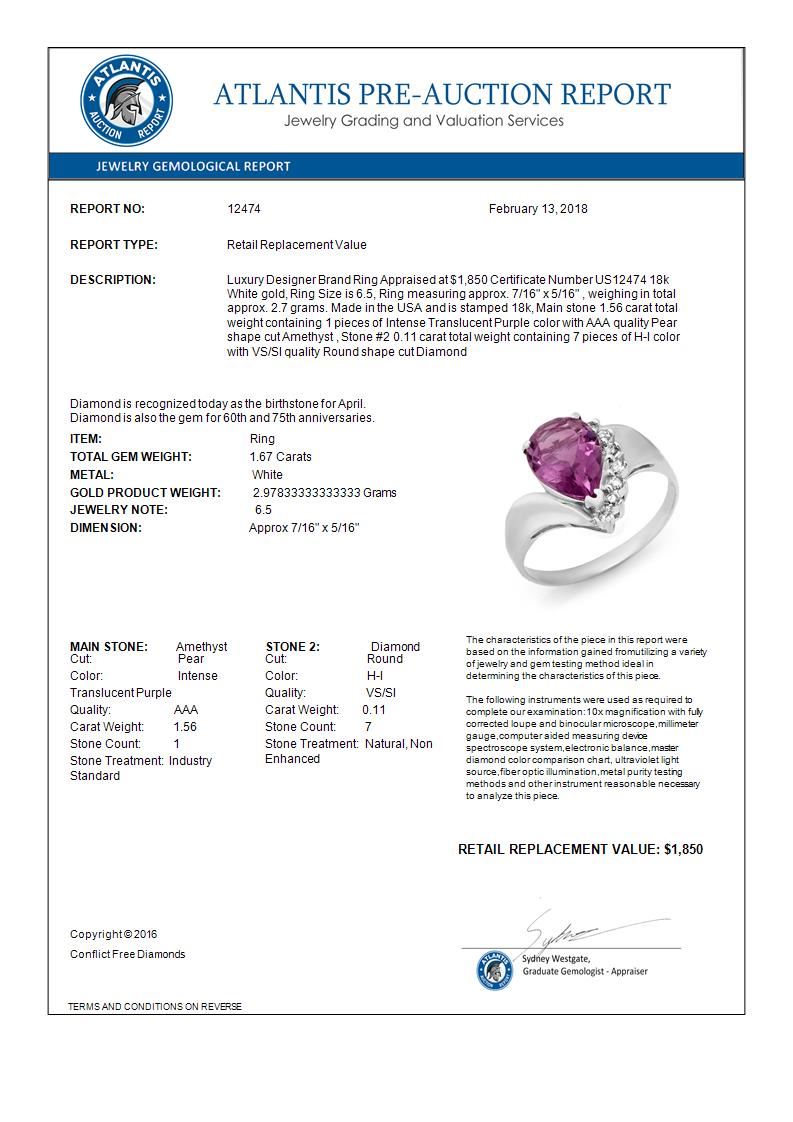REF-28W4F -12474 ---- 1.67 CTW Amethyst & Diamond Ring 18K White Gold ---- Luxury Designer Brand Ring Appraised at $1,850 Certificate Number US12474 18k White gold, Ring Size is 6.5, Ring measuring approx. 7/16" x 5/16" , weighing in total approx. 2.7 grams. Made in the USA and is stamped 18k, Main stone 1.56 carat total weight containing 1 pieces of Intense Translucent Purple color with AAA quality Pear shape cut Amethyst , Stone #2 0.11 carat total weight containing 7 pieces of H-I color with VS/SI quality Round shape cut Diamond