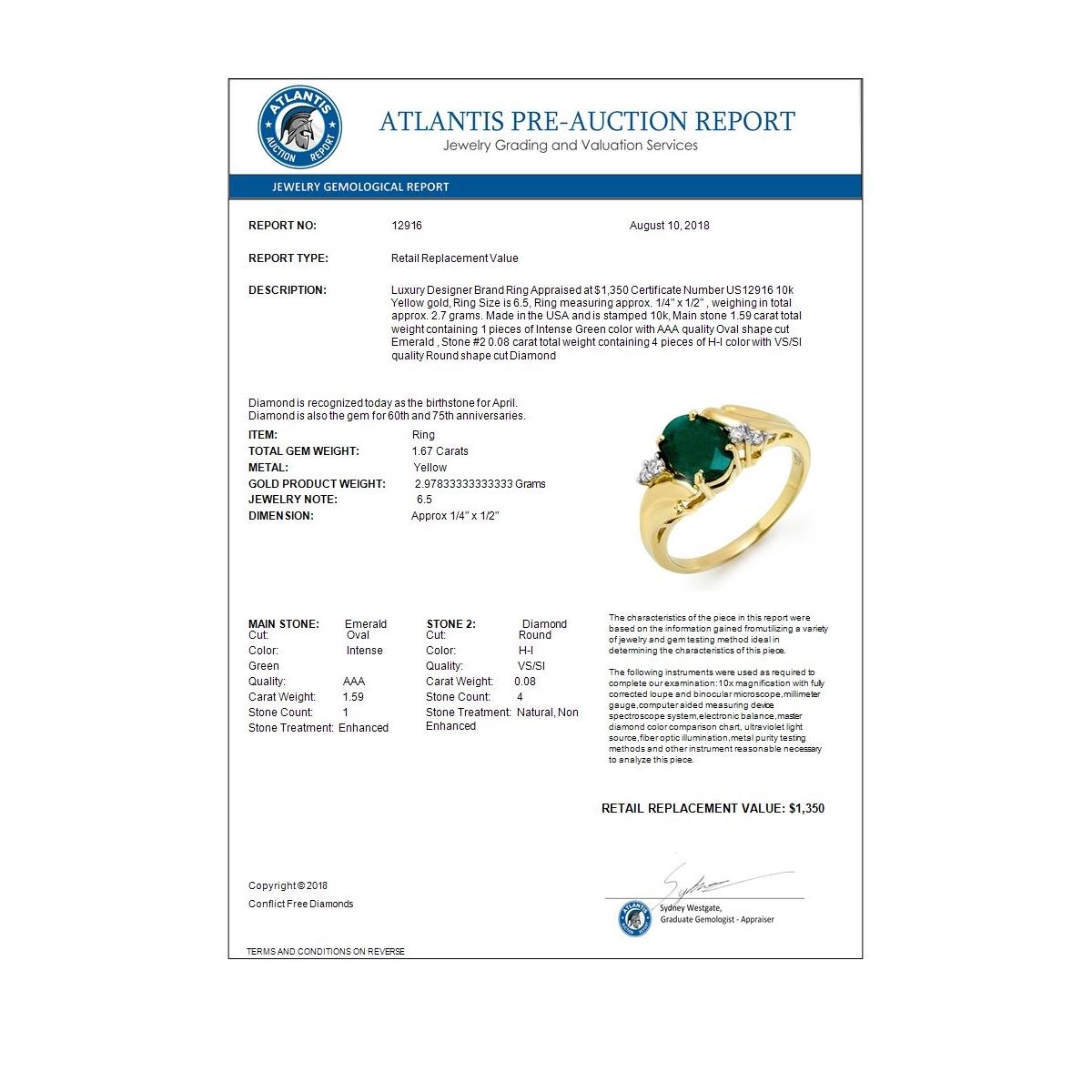 REF-20H5A -12916 ---- 1.67 CTW Emerald & Diamond Ring 10K Yellow Gold ---- Luxury Designer Brand Ring Appraised at $1,350 Certificate Number US12916 10k Yellow gold, Ring Size is 6.5, Ring measuring approx. 1/4" x 1/2" , weighing in total approx. 2.7 grams. Made in the USA and is stamped 10k, Main stone 1.59 carat total weight containing 1 pieces of Intense Green color with AAA quality Oval shape cut Emerald , Stone #2 0.08 carat total weight containing 4 pieces of H-I color with VS/SI quality Round shape cut Diamond