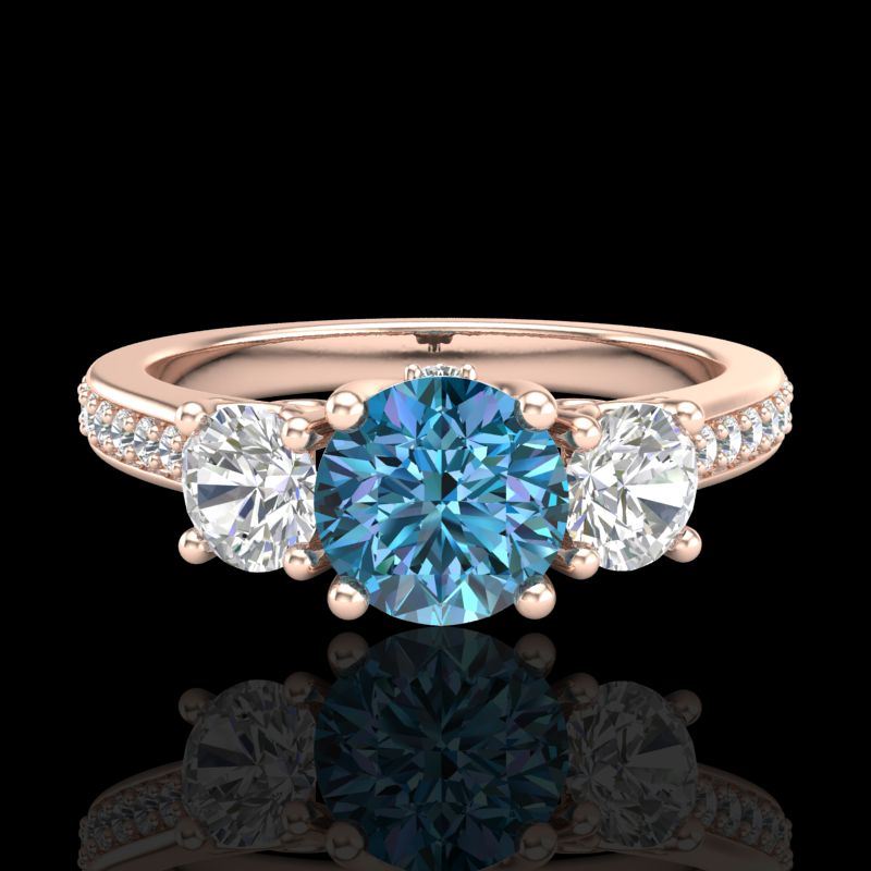 1.67 CTW Intense Blue Diamond Solitaire Art Deco 3 Stone Ring 18K Rose Gold ---- Luxury Designer Brand 3 stone ring Appraised Retail Price at $12,100 ---- SKU Number US37811 18k Rose gold 3 stone ring Size is 7, 3 stone ring measuring approx. Uniform, weighing in total approx. 8 grams. Made in the USA and is stamped 18k, Main stone 0.77 carat total weight containing 1 pieces of Intense Fancy Blue color with SI quality Round shape cut Diamond , Stone #2 0.55 carat total weight containing 2 pieces of H-I color with VS/SI quality Round shape cut