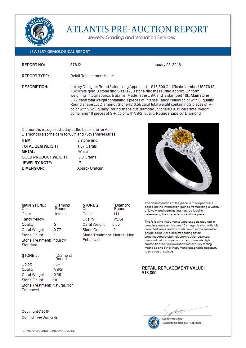 REF-254A5X -37812 ---- 1.67 CTW Intense Fancy Yellow Diamond Art Deco 3 Stone Ring 18K White Gold ---- Luxury Designer Brand 3 stone ring Appraised at $16,800 Certificate Number US37812 18k White gold, 3 stone ring Size is 7, 3 stone ring measuring approx. Uniform, weighing in total approx. 5 grams. Made in the USA and is stamped 18k, Main stone 0.77 carat total weight containing 1 pieces of Intense Fancy Yellow color with SI quality Round shape cut Diamond , Stone #2 0.55 carat total weight containing 2 pieces of H-I color with VS/SI quality Round shape cut Diamond , Stone #3 0.35 carat total weight containing 18 pieces of G-H color with VS/SI quality Round shape cut Diamond