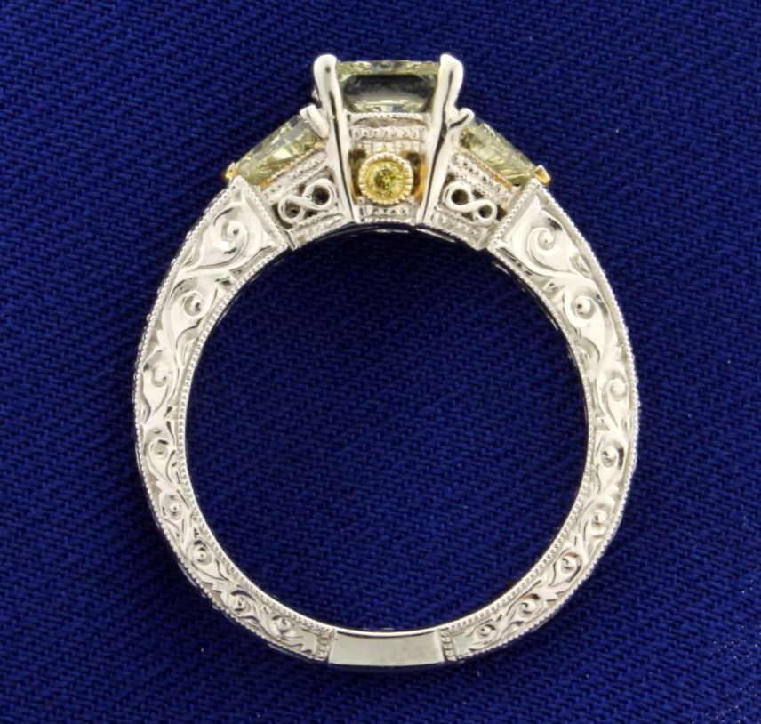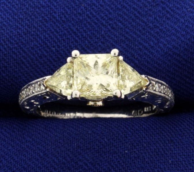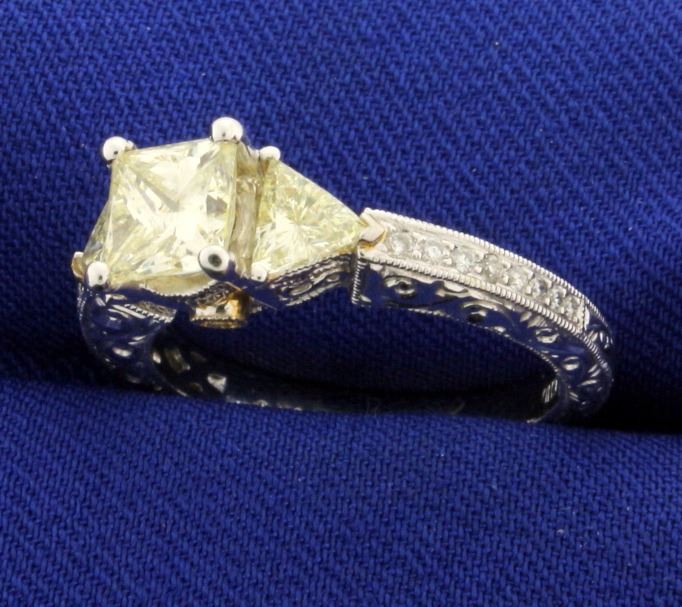 Stunning 1.67 carat diamond Princess Cut ring set in 18k white gold. The center is a high quality 1.01 carat Princess cut diamond, clarity VS1 and color L. There are two trillion cut side diamonds and two round diamonds that weigh approximately 0.66 carats total of VS clarity and K-L color. The ring is in new condition and offers fabulous style and detail. Size 7 5.5g