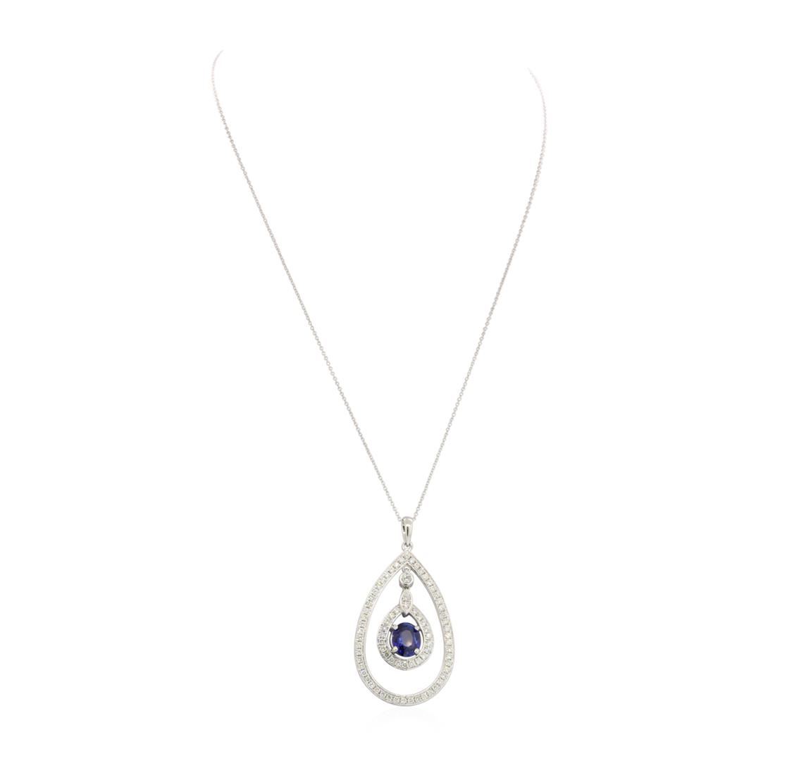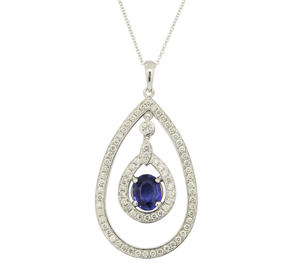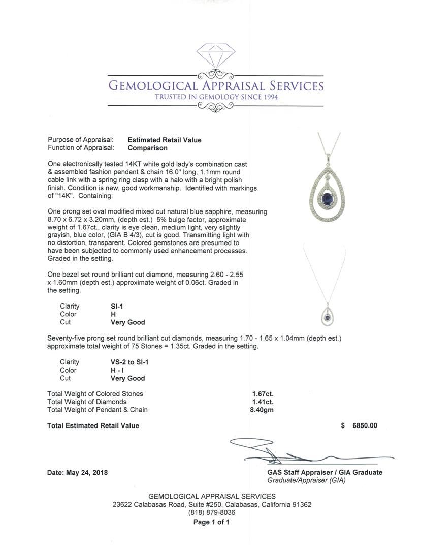 One electronically tested 14KT white gold lady's combination cast & assembled fashion pendant & chain 16.0' long, 1.1mm round cable link with a spring ring clasp with a halo with a bright polish finish. Identified with markings of '14K'. Condition is new, good workmanship. Containing: One prong set oval modified mixed cut natural blue sapphire, measuring 8.70 x 6.72 x 3.20mm, (depth est.) 5%. bulge factor, approximate weight of 1.67ct., clarity is eye clean, medium light, very slightly grayish, blue color, (GIA B 4/3), cut is good. Transmitting light with no distortion, transparent. Colored gemstones are presumed to have been subjected to commonly used enhancement processes. Graded in the setting. One bezel set round brilliant cut diamond, measuring 2.60 - 2.55 x 1.60mm (depth est.) approximate weight of 0.06ct. Graded in the setting. Color H Clarity SI-1 Cut Very Good Seventy-Five prong set round brilliant cut diamonds, measuring 1.70 - 1.65 x 1.04mm (depth est.) approximate total weight of 75 Stones = 1.35ct. Graded in the setting. Color H - I Clarity VS-2 to SI-1 Cut Very Good. Total Weight of Colored Stones 1.67ct.. Total Weight of Diamonds 1.41ct.. Total Weight of Pendant & Chain 8.40gm GAS Appraised at $6850.00. GAS Appraised.