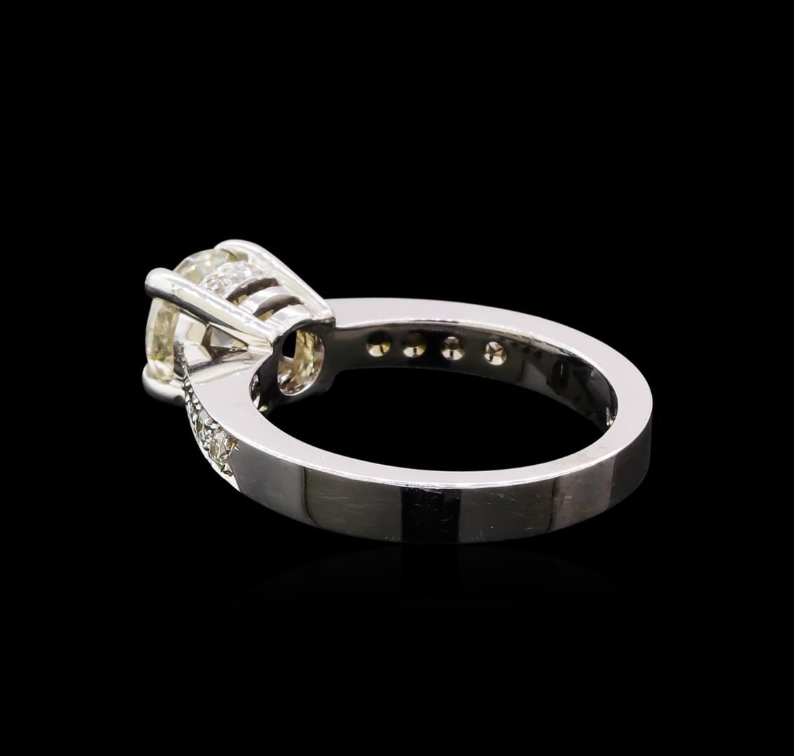 One electronically tested 14KT white gold lady's cast wedding ring with a cathedral shank with a bright polish finish. Featured lady's ring has a shank measuring 3.00 millimeters in width. Identified with markings of "14K". Condition is new, good workmanship. Containing: One prong set round brilliant cut diamond, measuring 6.94 - 6.90 x 5.10mm (depth est.) approximate weight of 1.47ct. Graded in the setting. Clarity: I-1. Color: J. Cut Very Good Six prong set round brilliant cut diamonds, measuring 2.00 - 1.70 x 1.15mm (depth est.) approximate total weight of 6 Stones = 0.14ct. Graded in the setting. Clarity: SI-1 to SI-2. Color: G - Good Ten prong set round brilliant cut diamonds, measuring 1.30 - 1.20 x 0.75mm (depth est.) approximate total weight of 10 Stones = 0.06ct. Graded in the setting. Clarity: SI-1 to SI-2. Color: H - I. Cut Good. Total Weight of Diamonds 1.67ct. Total Weight of Ring 5.60gm. GAS Appraised at $13,670.00.