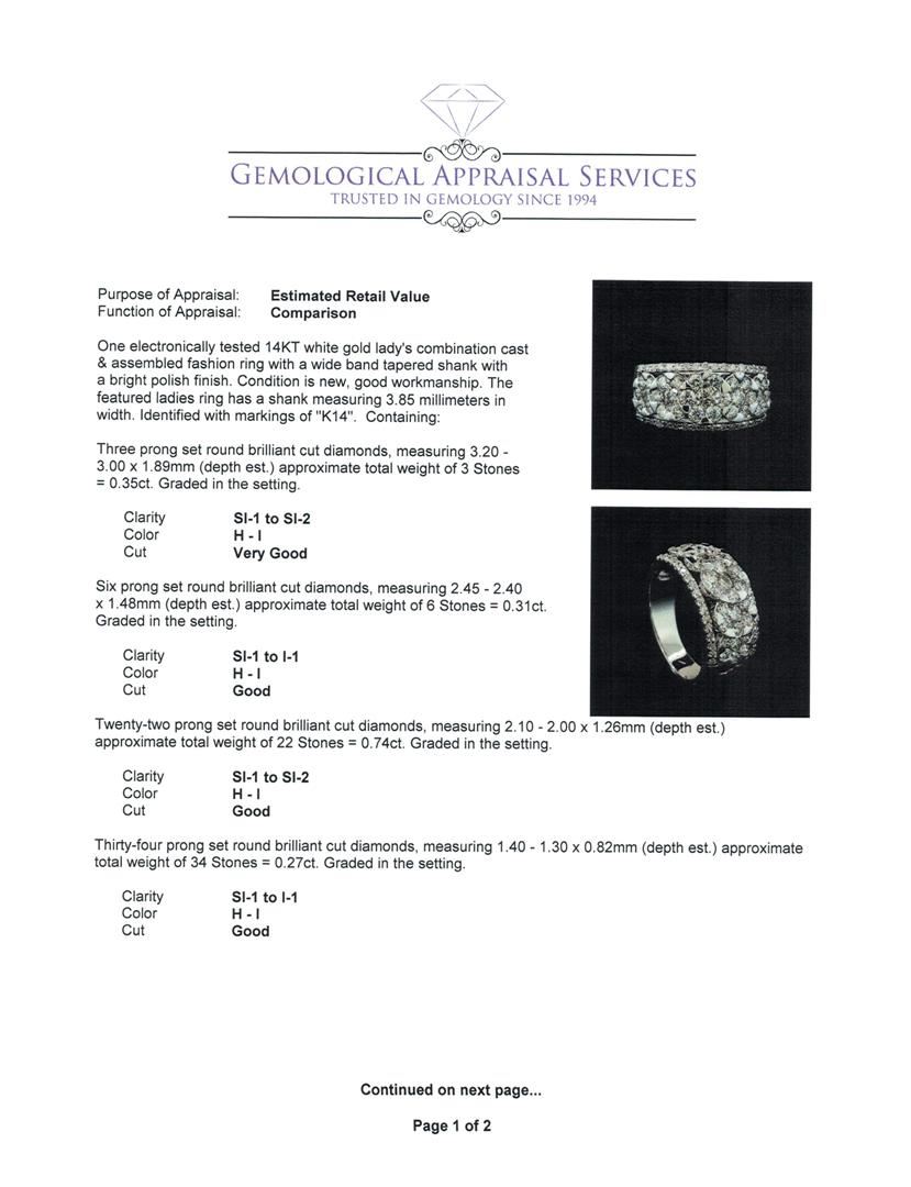 One electronically tested 14KT white gold lady's combination cast & assembled fashion ring with a wide band tapered shank with a bright polish finish. The featured ladies ring has a shank measuring 3.85 millimeters in width. Identified with markings of 'K14'. Condition is new, good workmanship. Containing: Three prong set round brilliant cut diamonds, measuring 3.20 - 3.00 x 1.89mm (depth est.) approximate total weight of 3 Stones = 0.35ct. Graded in the setting. Clarity SI-1 to SI-2. Color: H - I Cut Very Good Six prong set round brilliant cut diamonds, measuring 2.45 - 2.40 x 1.48mm (depth est.) approximate total weight of 6 Stones = 0.31ct. Graded in the setting. Clarity SI-1 to I-1. Color: H - I Cut Good Twenty-Two prong set round brilliant cut diamonds, measuring 2.10 - 2.00 x 1.26mm (depth est.) approximate total weight of 22 Stones = 0.74ct. Graded in the setting. Clarity SI-1 to SI-2. Color: H - I Cut Good Thirty-Four prong set round brilliant cut diamonds, measuring 1.40 - 1.30 x 0.82mm (depth est.) approximate total weight of 34 Stones = 0.27ct. Graded in the setting. Clarity SI-1 to I-1. Color: H - I Cut Good. Total Weight of Diamonds 1.67ct.. Total Weight of Ring 6.70gm GAS Appraised at $5,240.00.