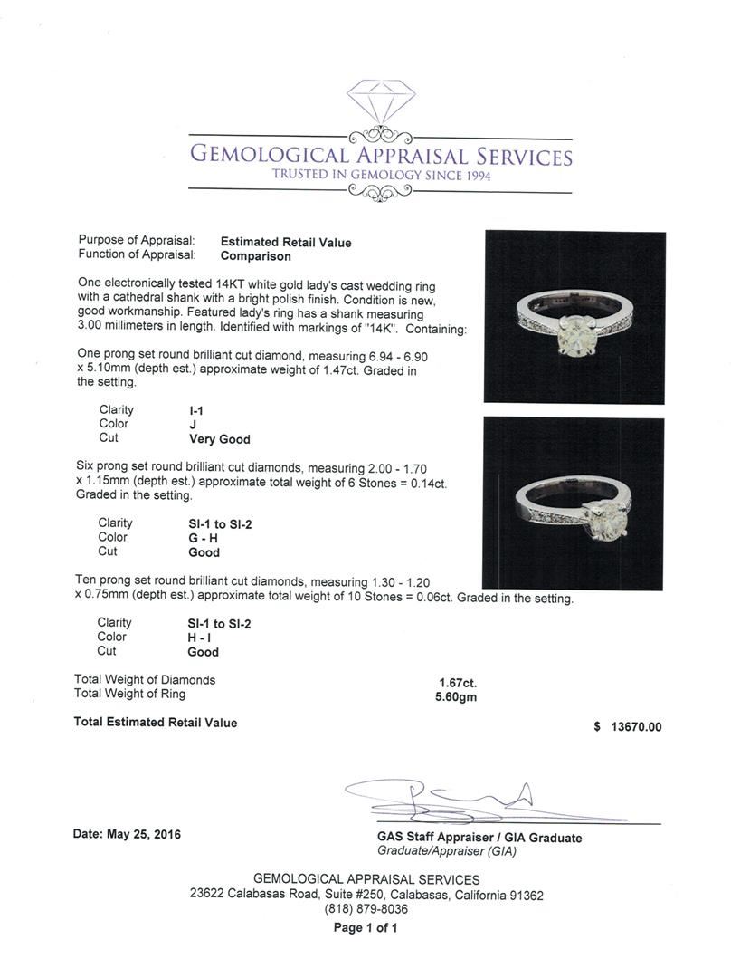 One electronically tested 14KT white gold lady's cast wedding ring with a cathedral shank with a bright polish finish. Featured lady's ring has a shank measuring 3.00 millimeters in width. Identified with markings of "14K". Condition is new, good workmanship. Containing: One prong set round brilliant cut diamond, measuring 6.94 - 6.90 x 5.10mm (depth est.) approximate weight of 1.47ct. Graded in the setting. Clarity: I-1. Color: J. Cut Very Good Six prong set round brilliant cut diamonds, measuring 2.00 - 1.70 x 1.15mm (depth est.) approximate total weight of 6 Stones = 0.14ct. Graded in the setting. Clarity: SI-1 to SI-2. Color: G - Good Ten prong set round brilliant cut diamonds, measuring 1.30 - 1.20 x 0.75mm (depth est.) approximate total weight of 10 Stones = 0.06ct. Graded in the setting. Clarity: SI-1 to SI-2. Color: H - I. Cut Good. Total Weight of Diamonds 1.67ct. Total Weight of Ring 5.60gm. GAS Appraised at $13,670.00.