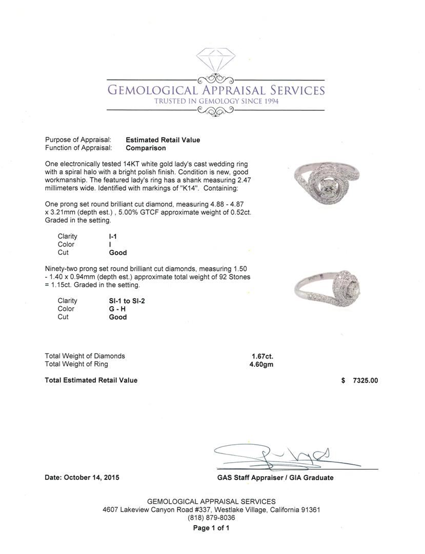 One electronically tested 14KT white gold lady's cast wedding ring with a spiral halo with a bright polish finish. The featured lady's ring has a shank measuring 2.47 millimeters wide. Identified with markings of "K14". Condition is new, good workmanship. Containing: One prong set round brilliant cut diamond, measuring 4.88 - 4.87 x 3.21mm (depth est.) , 5.00% GTCF approximate weight of 0.52ct. Graded in the setting. Clarity: I-1. Color: I. Cut Good Ninety-Two prong set round brilliant cut diamonds, measuring 1.50 - 1.40 x 0.94mm (depth est.) approximate total weight of 92 Stones = 1.15ct. Graded in the setting. Clarity: SI-1 to SI-2. Color: G - H. Cut Good. Total Weight of Diamonds 1.67ct. Total Weight of Ring 4.60gm. GAS Appraised at $7,325.00.