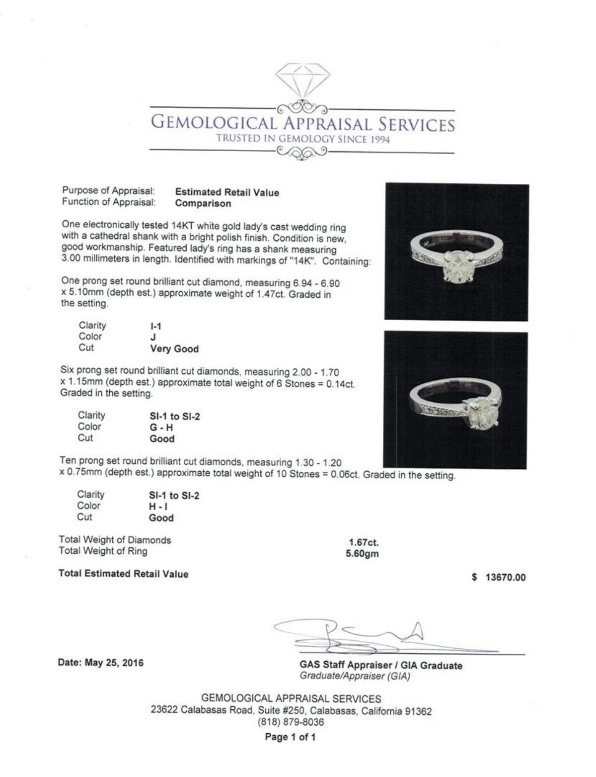 One electronically tested 14KT white gold lady's cast wedding ring with a cathedral shank with a bright polish finish. Featured lady's ring has a shank measuring 3.00 millimeters in width. Identified with markings of "14K". Condition is new, good workmanship. Containing: One prong set round brilliant cut diamond, measuring 6.94 - 6.90 x 5.10mm (depth est.) approximate weight of 1.47ct. Graded in the setting. Clarity: I-1. Color: J. Cut Very Good Six prong set round brilliant cut diamonds, measuring 2.00 - 1.70 x 1.15mm (depth est.) approximate total weight of 6 Stones = 0.14ct. Graded in the setting. Clarity: SI-1 to SI-2. Color: G - Good Ten prong set round brilliant cut diamonds, measuring 1.30 - 1.20 x 0.75mm (depth est.) approximate total weight of 10 Stones = 0.06ct. Graded in the setting. Clarity: SI-1 to SI-2. Color: H - I. Cut Good. Total Weight of Diamonds 1.67ct. Total Weight of Ring 5.60gm. GAS Appraised.