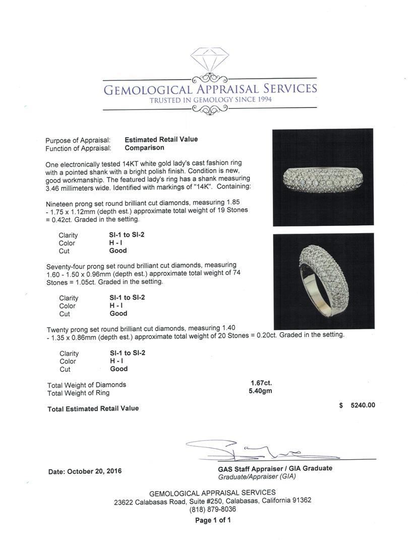 One electronically tested 14KT white gold lady's cast fashion ring with a pointed shank with a bright polish finish. The featured lady's ring has a shank measuring 3.46 millimeters wide. Identified with markings of '14K'. Condition is new, good workmanship. Containing: Nineteen prong set round brilliant cut diamonds, measuring 1.85 - 1.75 x 1.12mm (depth est.) approximate total weight of 19 Stones = 0.42ct. Graded in the setting. Clarity SI-1 to SI-2. Color: H - I Cut Good Seventy-Four prong set round brilliant cut diamonds, measuring 1.60 - 1.50 x 0.96mm (depth est.) approximate total weight of 74 Stones = 1.05ct. Graded in the setting. Clarity SI-1 to SI-2. Color: H - I Cut Good Twenty prong set round brilliant cut diamonds, measuring 1.40 - 1.35 x 0.86mm (depth est.) approximate total weight of 20 Stones = 0.20ct. Graded in the setting. Clarity SI-1 to SI-2. Color: H - I Cut Good. Total Weight of Diamonds 1.67ct.. Total Weight of Ring 5.40gm. GAS Appraised.
