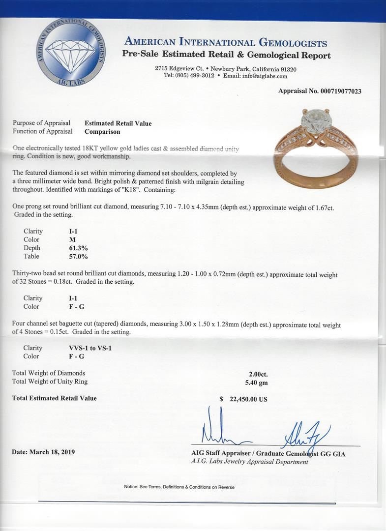 One 1.67ct Diamond Ring - 18KT Yellow Gold. AIG certified. See Appraisal for more details. AIG Appraised.