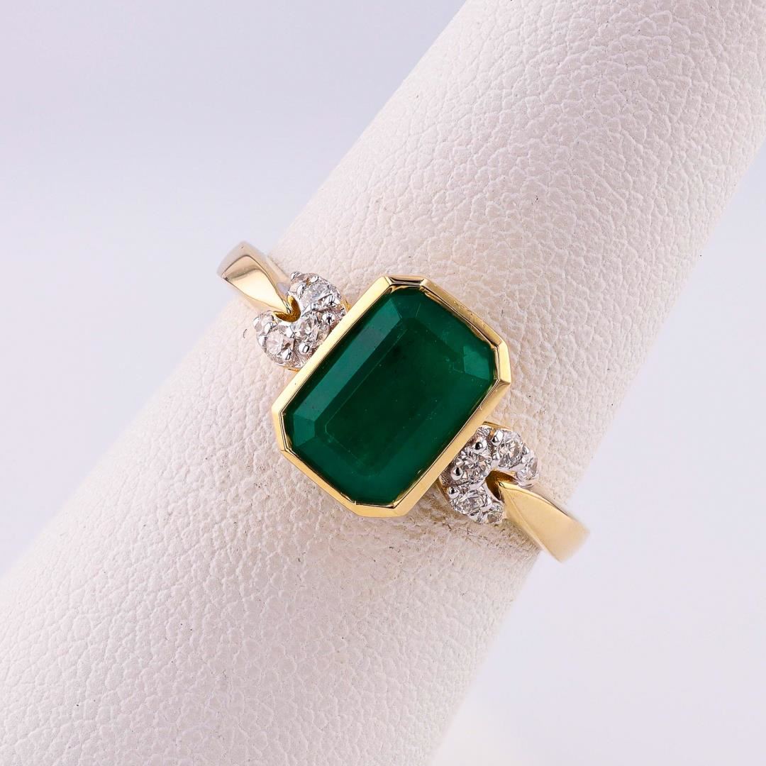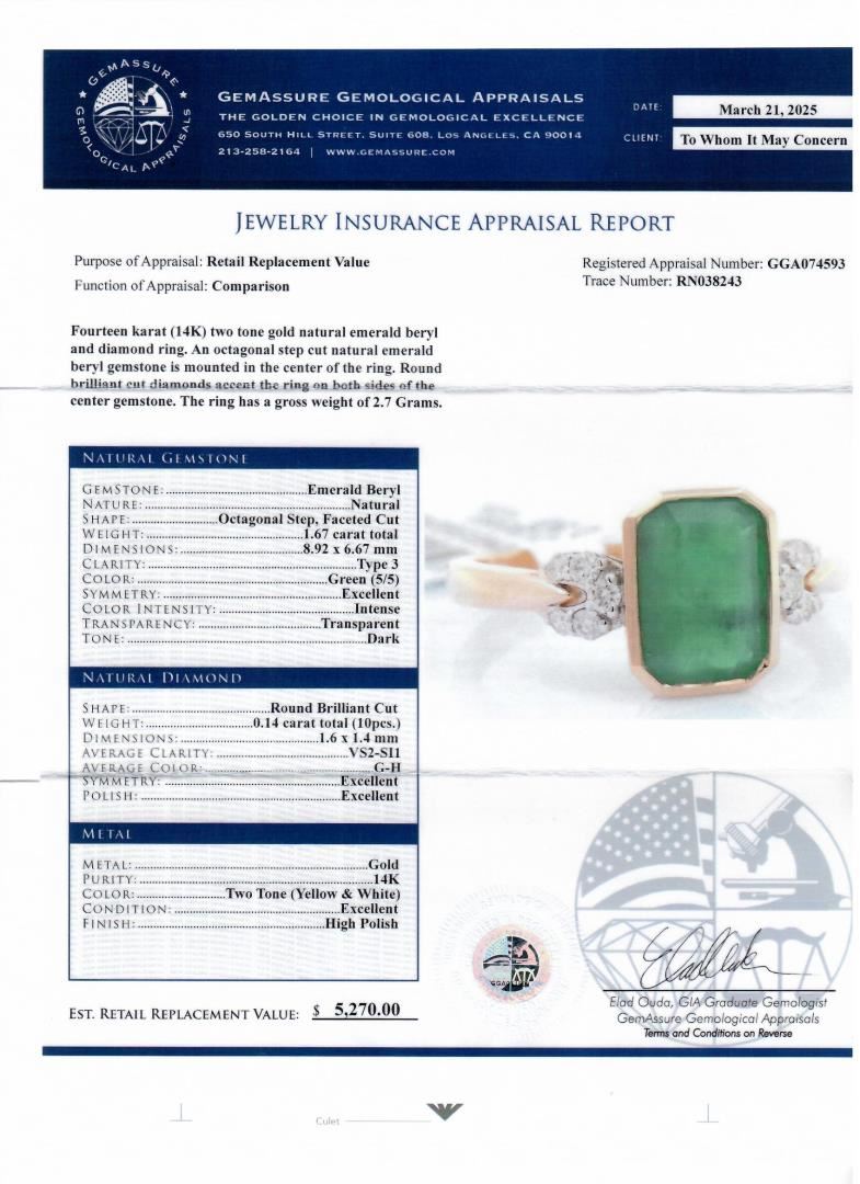 Fourteen karat (14K) two tone gold natural emerald beryl and diamond ring. An octagonal step cut natural emerald beryl gemstone is mounted in the center of the ring. Round brilliant cut diamonds accent the ring on both sides of the center gemstone. The ring has a gross weight of 2.7 Grams. Brand: Oscar Friedman #NATURAL GEMSTONE# GEMSTONE: Emerald Beryl NATURE: Natural SHAPE: Octagonal Step, Faceted Cut WEIGHT: 1.67 carat total DIMENSIONS: 8.92 x 6.67mm CLARITY: Type 3 COLOR: Green (5/5) SYMMETRY: Excellent COLOR INTENSITY: Intense TRANSPARENCY: Transparent TONE: Dark #NATURAL DIAMOND# SHAPE: Round Brilliant Cut WEIGHT: 0.14 carat total (10pcs.) DIMENSIONS: 1.6 x 1.4mm AVERAGE CLARITY: VS2-SI1 AVERAGE COLOR: G-H SYMMETRY: Excellent POLLISH: Excellent #METAL# METAL: Gold PURITY: 14K COLOR: Two Tone (Yellow & White) CONDITION: Excellent FINISH: High Polish Size: 6 3/4