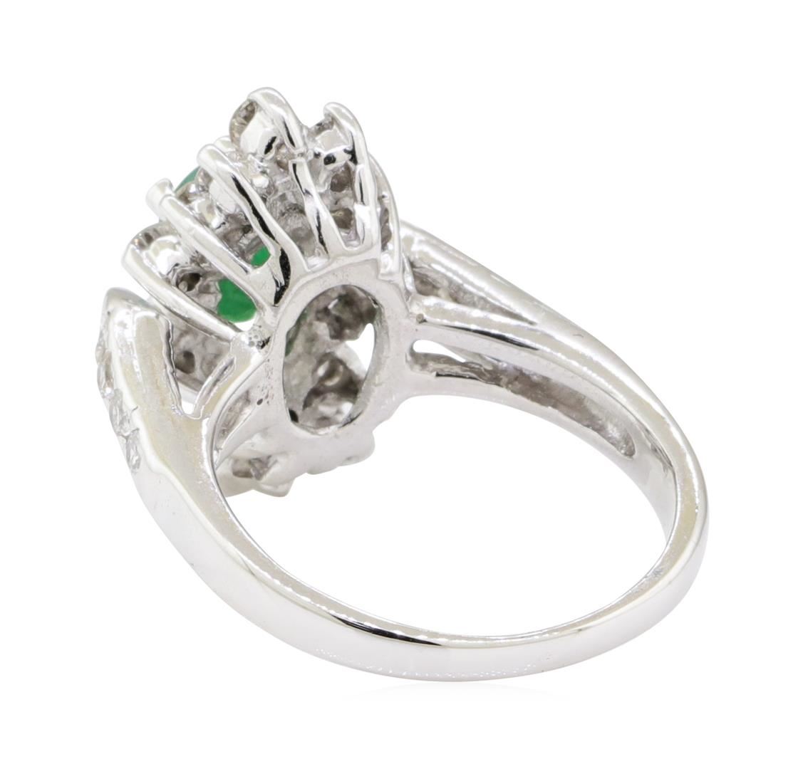 One electronically tested 14KT white gold lady's cast fashion ring with a waterfall cluster motif with a bright polish finish. The featured lady's ring has a shank measuring 1.80 millimeters wide. Identified with markings of '14K'. Condition is used, good workmanship. Containing: One prong set oval modified mixed cut natural emerald, measuring 6.80 x 5.24 x 3.28mm, (depth est.) approximate weight of 0.67ct., clarity is heavily included, medium, moderately strong, green color, (GIA G 5/4), cut is good. Transmitting light somewhat diffusely, semi-transparent to translucent. Naturally occurring internal & external characteristics are present. Indications of oil residue. Colored gemstones are presumed to have been subjected to commonly used enhancement processes. Graded in the setting. Twenty-Four prong set round brilliant cut diamonds, measuring 2.50 - 2.00 x 1.40mm (depth est.) approximate total weight of 24 Stones = 1.00ct. Graded in the setting. Color G - I Clarity VS-2 to SI-2 Cut Good. Total Weight of Colored Stones 0.67ct.. Total Weight of Diamonds 1.00ct.. Total Weight of Ring 4.90gm GAS Appraised at $3640.00. GAS Appraised at $3,640.00.