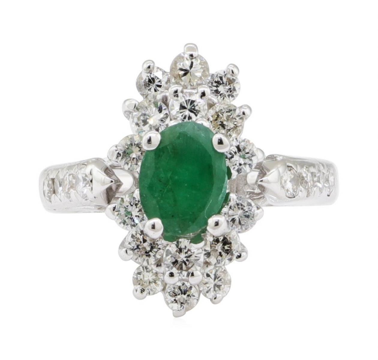 One electronically tested 14KT white gold lady's cast fashion ring with a waterfall cluster motif with a bright polish finish. The featured lady's ring has a shank measuring 1.80 millimeters wide. Identified with markings of '14K'. Condition is used, good workmanship. Containing: One prong set oval modified mixed cut natural emerald, measuring 6.80 x 5.24 x 3.28mm, (depth est.) approximate weight of 0.67ct., clarity is heavily included, medium, moderately strong, green color, (GIA G 5/4), cut is good. Transmitting light somewhat diffusely, semi-transparent to translucent. Naturally occurring internal & external characteristics are present. Indications of oil residue. Colored gemstones are presumed to have been subjected to commonly used enhancement processes. Graded in the setting. Twenty-Four prong set round brilliant cut diamonds, measuring 2.50 - 2.00 x 1.40mm (depth est.) approximate total weight of 24 Stones = 1.00ct. Graded in the setting. Color G - I Clarity VS-2 to SI-2 Cut Good. Total Weight of Colored Stones 0.67ct.. Total Weight of Diamonds 1.00ct.. Total Weight of Ring 4.90gm GAS Appraised at $3640.00. GAS Appraised at $3,640.00.