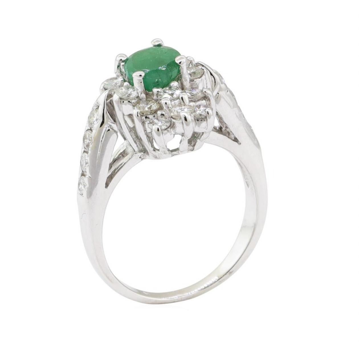 One electronically tested 14KT white gold lady's cast fashion ring with a waterfall cluster motif with a bright polish finish. The featured lady's ring has a shank measuring 1.80 millimeters wide. Identified with markings of '14K'. Condition is used, good workmanship. Containing: One prong set oval modified mixed cut natural emerald, measuring 6.80 x 5.24 x 3.28mm, (depth est.) approximate weight of 0.67ct., clarity is heavily included, medium, moderately strong, green color, (GIA G 5/4), cut is good. Transmitting light somewhat diffusely, semi-transparent to translucent. Naturally occurring internal & external characteristics are present. Indications of oil residue. Colored gemstones are presumed to have been subjected to commonly used enhancement processes. Graded in the setting. Twenty-Four prong set round brilliant cut diamonds, measuring 2.50 - 2.00 x 1.40mm (depth est.) approximate total weight of 24 Stones = 1.00 ct. Graded in the setting. Color G - I Clarity VS-2 to SI-2 Cut Good. Total Weight of Colored Stones 0.67ct.. Total Weight of Diamonds 1.00 ct.. Total Weight of Ring 4.90gm GAS Appraised at $3640.00. GAS Appraised.