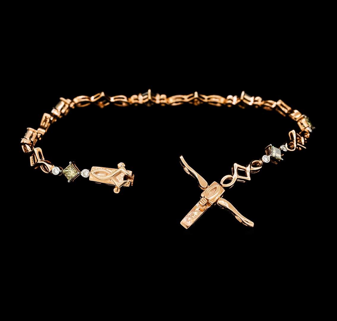 One electronically tested 14KT rose gold lady's combination cast & assembled fashion bracelet with a tongue clasp with double foldover safeties with a bright polish finish. The featured lady's bracelet measures approximately 7.5 inches in length. Identified with markings of '14K'. Condition is new, good workmanship. Containing: Seven prong set princess cut diamonds, measuring 3.30 x 3.00 x 2.25mm (depth est.) approximate total weight of 7 Stones = 1.38ct. Colored gemstones are presumed to have been subjected to commonly used enhancement processes. Graded in the setting. Color Fancy Light Brownish Greenish Yellow Clarity VS-2 to SI-2 Cut Good Fourteen bezel set round brilliant cut diamonds, measuring 1.80 - 1.70 x 1.09mm (depth est.) approximate total weight of 14 Stones = 0.29ct. Graded in the setting. Color H - I Clarity SI-1 to SI-2 Cut Very Good. Total Weight of Diamonds 1.67ct.. Total Weight of Bracelet 8.70gm GAS Appraised at $4215.00. GAS Appraised.
