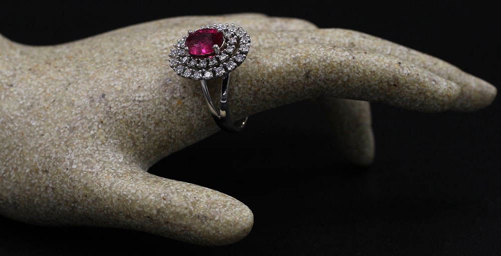 One lady's anniversary band ring featuring: 14KT white gold weighing 8.21 grams containing one rubellite weighing 1.67ct and 32 diamonds weighing 0.92ctw. The rubellite measures approximately 9.37 x 7.33mm and is oval shape with fine clarity and deep pink color with excellent cut. The diamonds are round brilliant cut and are natural, unenhanced stones with SI-1 clarity, G-H color and excellent cut. The ring is a size 6.5 but is resizable.
