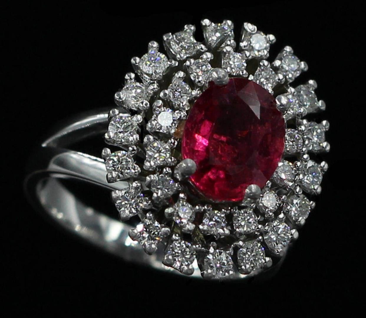 One lady's anniversary band ring featuring: 14KT white gold weighing 8.21 grams containing one rubellite weighing 1.67ct and 32 diamonds weighing 0.92ctw. The rubellite measures approximately 9.37 x 7.33mm and is oval shape with fine clarity and deep pink color with excellent cut. The diamonds are round brilliant cut and are natural, unenhanced stones with SI-1 clarity, G-H color and excellent cut. The ring is a size 6.5 but is resizable.