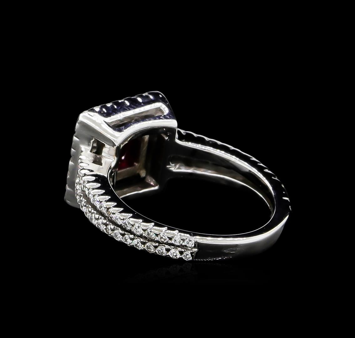 One electronically tested 14KT white gold ladies cast ruby and diamond ring with a bright polish finish. The featured ruby is set within a diamond bezel supported by diamond set split shoulders, completed by a two millimeter wide band. Identified with markings of "14K". Condition is good. Containing: One prong set oval mixed cut natural ruby, measuring 7.30 x 6.50 x 4.00mm, 5%. bulge factor, approximate weight of 1.67ct., clarity is heavily included, type II, medium dark, very slightly brownish, red color, (GIA R 6/3), cut is good. Transmitting light with a minimum of distortion, transparent. Naturally occurring internal & external characteristics are present. Graded in the setting. Twenty-Four prong set round brilliant cut diamonds, measuring 1.30 - 1.30 x 0.78mm (depth est.) approximate total weight of 24 Stones = 0.22ct. Graded in the setting. Clarity: VS-2 to SI-1. Color: G - I Sixty-Four prong set round brilliant cut diamonds, measuring 1.10 - 1.00 x 0.63mm (depth est.) approximate total weight of 64 Stones = 0.30ct. Graded in the setting. Clarity: VS-2 to SI-1. Color: G - I. Total Weight of Colored Stones 1.67ct. Total Weight of Diamonds 0.52ct. Total Weight of Ring 5.76gm. AIG Appraised at $5,260.00.