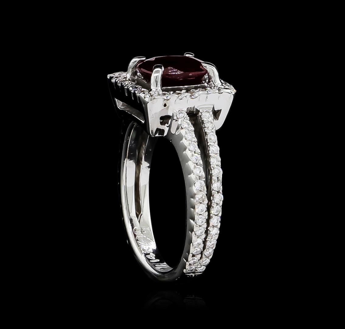 One electronically tested 14KT white gold ladies cast ruby and diamond ring with a bright polish finish. The featured ruby is set within a diamond bezel supported by diamond set split shoulders, completed by a two millimeter wide band. Identified with markings of "14K". Condition is good. Containing: One prong set oval mixed cut natural ruby, measuring 7.30 x 6.50 x 4.00mm, 5%. bulge factor, approximate weight of 1.67ct., clarity is heavily included, type II, medium dark, very slightly brownish, red color, (GIA R 6/3), cut is good. Transmitting light with a minimum of distortion, transparent. Naturally occurring internal & external characteristics are present. Graded in the setting. Twenty-Four prong set round brilliant cut diamonds, measuring 1.30 - 1.30 x 0.78mm (depth est.) approximate total weight of 24 Stones = 0.22ct. Graded in the setting. Clarity: VS-2 to SI-1. Color: G - I Sixty-Four prong set round brilliant cut diamonds, measuring 1.10 - 1.00 x 0.63mm (depth est.) approximate total weight of 64 Stones = 0.30ct. Graded in the setting. Clarity: VS-2 to SI-1. Color: G - I. Total Weight of Colored Stones 1.67ct. Total Weight of Diamonds 0.52ct. Total Weight of Ring 5.76gm. AIG Appraised at $5,260.00.