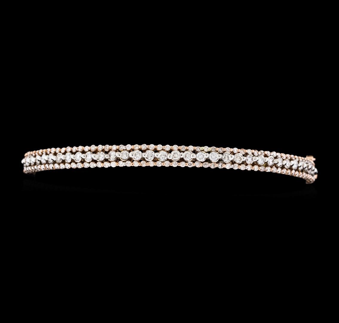 One electronically tested 14KT rose gold lady's combination cast & assembled fashion bangle bracelet with a tongue clasp with foldover safety with a bright polish finish. The featured lady's bracelet measures approximately 7 inches in length. Identified with markings of 'K14'. Condition is new, good workmanship. Containing: Thirty-Three prong set round brilliant cut diamonds, measuring 2.00 - 1.80 x 1.18mm (depth est.) approximate total weight of 33 Stones = 0.90ct. Graded in the setting. Clarity SI-1 to SI-2. Color: H - I Cut Good One Hundred Ten prong set round brilliant cut diamonds, measuring 1.30 - 1.15 x 0.76mm (depth est.) approximate total weight of 110 Stones = 0.78ct. Graded in the setting. Clarity SI-1 to I-1. Color: H - I Cut Good. Total Weight of Diamonds 1.68ct.. Total Weight of Bangle Bracelet 12.10gm. GAS Appraised at $6,705.00.