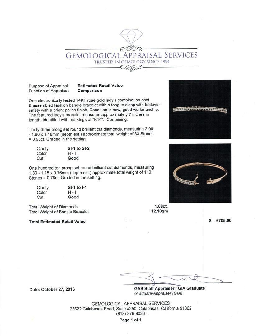 One electronically tested 14KT rose gold lady's combination cast & assembled fashion bangle bracelet with a tongue clasp with foldover safety with a bright polish finish. The featured lady's bracelet measures approximately 7 inches in length. Identified with markings of 'K14'. Condition is new, good workmanship. Containing: Thirty-Three prong set round brilliant cut diamonds, measuring 2.00 - 1.80 x 1.18mm (depth est.) approximate total weight of 33 Stones = 0.90 ct. Graded in the setting. Clarity SI-1 to SI-2. Color: H - I Cut Good One Hundred Ten prong set round brilliant cut diamonds, measuring 1.30 - 1.15 x 0.76mm (depth est.) approximate total weight of 110 Stones = 0.78ct. Graded in the setting. Clarity SI-1 to I-1. Color: H - I Cut Good. Total Weight of Diamonds 1.68ct.. Total Weight of Bangle Bracelet 12.10gm. GAS Appraised.
