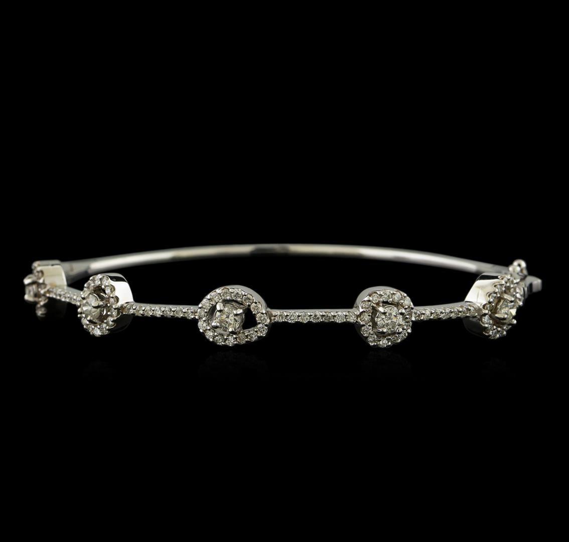 One electronically tested 14KT white gold lady's combination cast & assembled fashion bangle bracelet with a tongue clasp with foldover safety with a bright polish finish. The featured lady's bracelet measures approximately 7.25 inches in circumference. Identified with markings of "K14". Condition is new, good workmanship. Containing: Five prong set round brilliant cut diamonds, measuring 3.40 - 3.30 x 2.04mm (depth est.) approximate total weight of 5 Stones = 0.70ct. Graded in the setting. Clarity: SI-1 to SI-2. Color: H - I. Cut Very Good One Hundred Two prong set round brilliant cut diamonds, measuring 1.40 - 1.30 x 0.84mm (depth est.) approximate total weight of 102 Stones = 0.98ct. Graded in the setting. Clarity: SI-1 to SI-2. Color: H - I. Cut Good. Total Weight of Diamonds 1.68ct. Total Weight of Bangle Bracelet 13.50gm. GAS Appraised at $6,990.00.