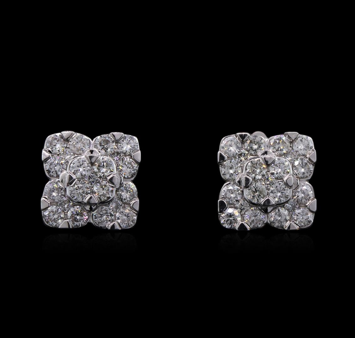 One pair electronically tested 14KT white gold cast & assembled diamond cluster earrings. The earrings feature a floral designed gallery of round brilliant diamonds. Bright polish finish. Identified with markings of "585". Condition is new, good workmanship. Containing: Thirty-Two prong set round brilliant cut diamonds, measuring 2.30 - 2.20 x 1.35mm (depth est.), 5.00% GTCF approximate total weight of 32 Stones = 1.50ct. Graded in the setting. Clarity: SI-2 to I-2. Color: G - H. Ten prong set round brilliant cut diamonds, measuring 1.70 - 1.70 x 1.02mm (depth est.) approximate total weight of 10 Stones = 0.18ct. Graded in the setting. Clarity: SI-1 to SI-3. Color: G - H. Total Weight of Diamonds 1.68ct. Total Weight of Earrings 5.61gm. AIG Appraised at $5,290.00.