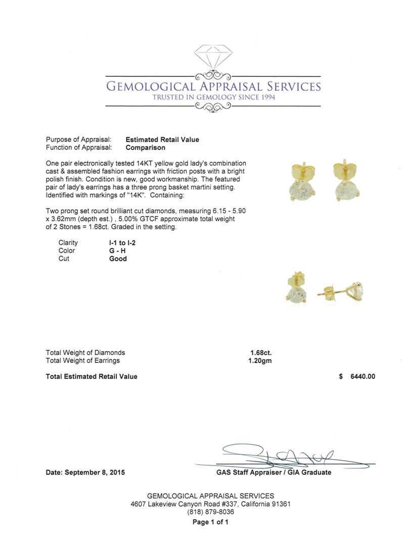 One pair electronically tested 14KT yellow gold lady's combination cast & assembled fashion earrings with friction posts with a bright polish finish. The featured pair of lady's earrings has a three prong basket martini setting. Identified with markings of "14K". Condition is new, good workmanship. Containing: Two prong set round brilliant cut diamonds, measuring 6.15 - 5.90 x 3.62mm (depth est.) , 5.00.%. GTCF approximate total weight of 2 Stones = 1.68ct. Graded in the setting. Clarity: I-1 to I-2. Color: G - Good. Total Weight of Diamonds 1.68ct. Total Weight of Earrings 1.20gm. GAS Appraised at $6,440.00.