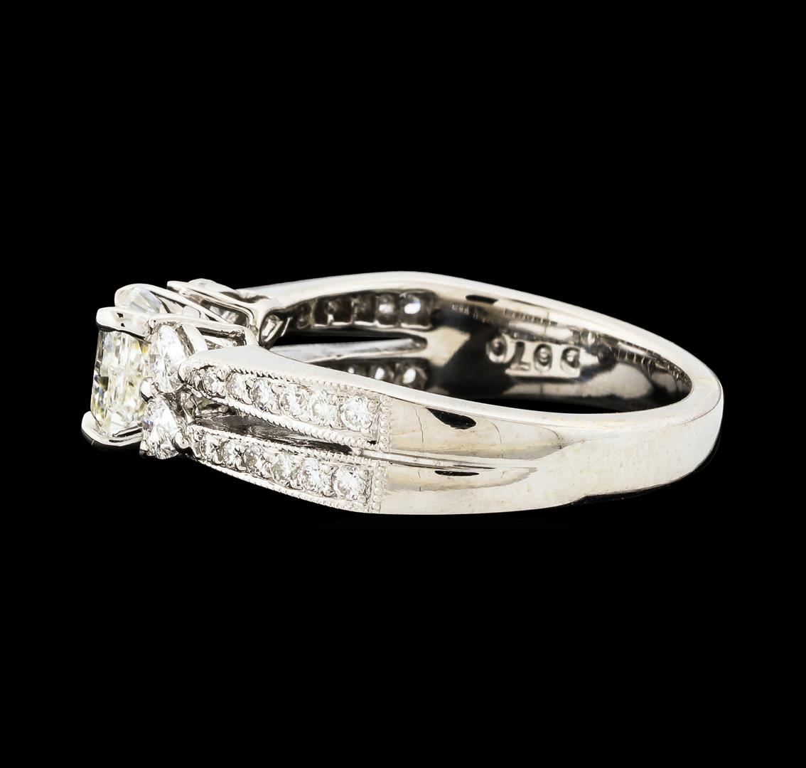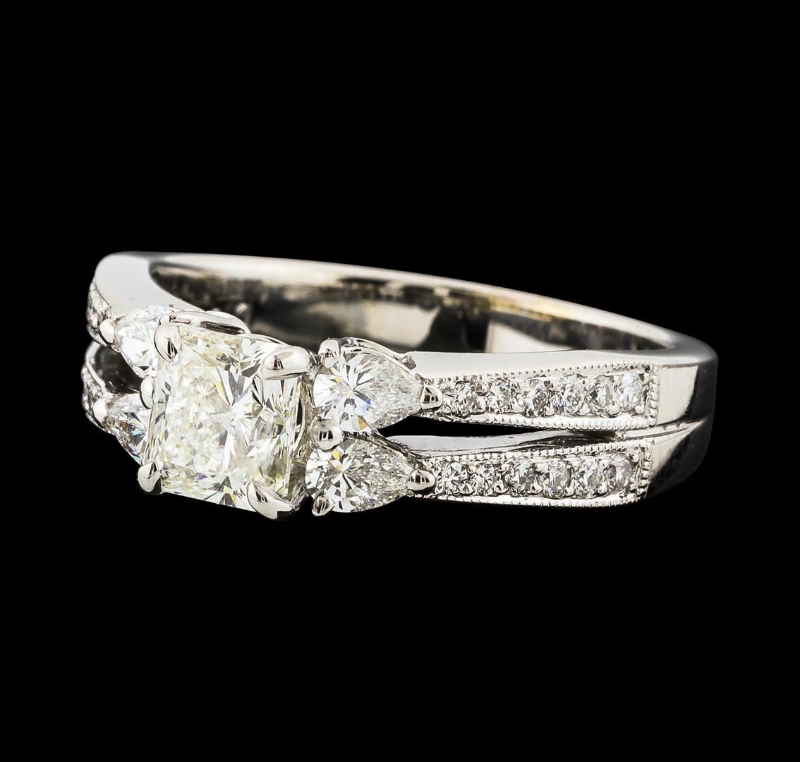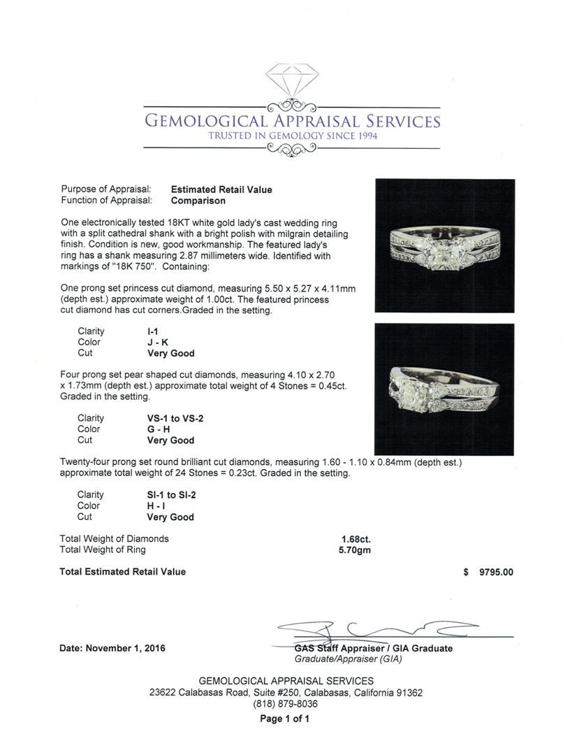 One electronically tested 18KT white gold lady's cast wedding ring with a split cathedral shank with a bright polish with milgrain detailing finish. The featured lady's ring has a shank measuring 2.87 millimeters wide. Identified with markings of '18K 750'. Condition is new, good workmanship. Containing: One prong set princess cut diamond, measuring 5.50 x 5.27 x 4.11mm (depth est.) approximate weight of 1.00ct. The featured princess cut diamond has cut corners. Graded in the setting. Clarity I-1. Color: J - K Cut Very Good Four prong set pear shaped cut diamonds, measuring 4.10 x 2.70 x 1.73mm (depth est.) approximate total weight of 4 Stones = 0.45ct. Graded in the setting. Clarity VS-1 to VS-2. Color: G - H Cut Very Good Twenty-Four prong set round brilliant cut diamonds, measuring 1.60 - 1.10 x 0.84mm (depth est.) approximate total weight of 24 Stones = 0.23ct. Graded in the setting. Clarity SI-1 to SI-2. Color: H - I Cut Very Good. Total Weight of Diamonds 1.68ct.. Total Weight of Ring 5.70gm. GAS Appraised at $9,795.00.
